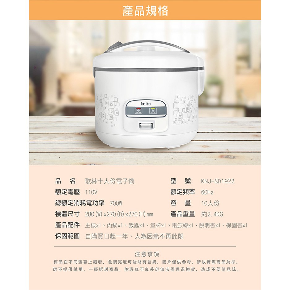 ※便利購※附發票 免運 KOLIN 歌林 10人份 電子鍋 厚釜不沾內鍋 電鍋 電子鍋 KNJ-SD1922