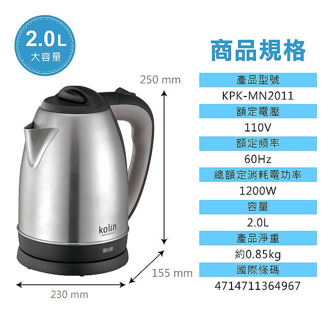 ❤免運天天出貨❤歌林 Kolin 2.0L 304 不鏽鋼 快煮壺 KPK-MN2009電熱壺 熱水壺