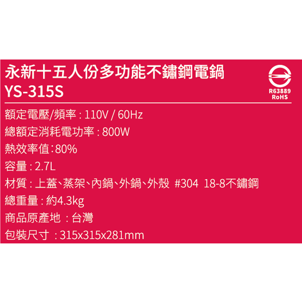 《大桃園家電館》永新 15人份多功能不鏽鋼電鍋 YS-315S原舊款YS-105S