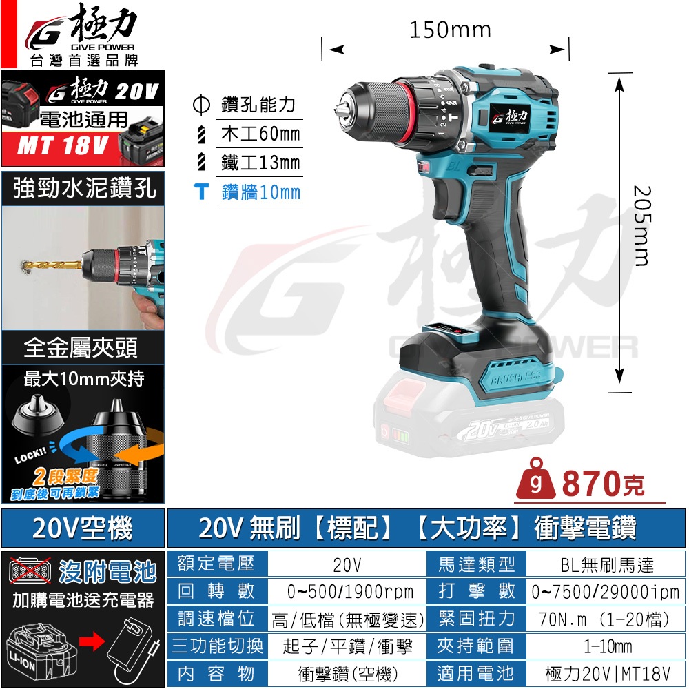 《極力》BSMI檢驗合格 電鑽 無刷電鑽 衝擊鑽 電動起子 無極變速 大扭力電鑽 起子機 20V 電鑽 18V電鑽