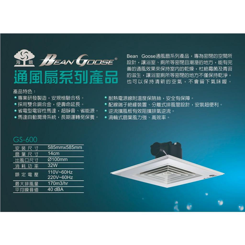 《海戰車電料》BeanGoose海鵝牌 GS-600 輕鋼架型浴室 通風扇/換氣扇/抽風扇/排風扇 電容式馬達 220V