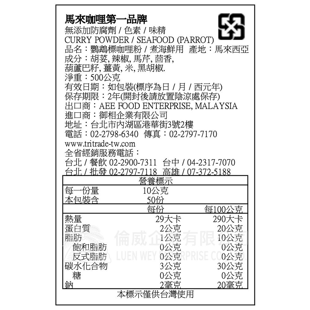 【倫威】馬來西亞 鸚鵡牌 咖哩粉 南洋咖哩用 素食可 500g - 肉類 / 海鮮