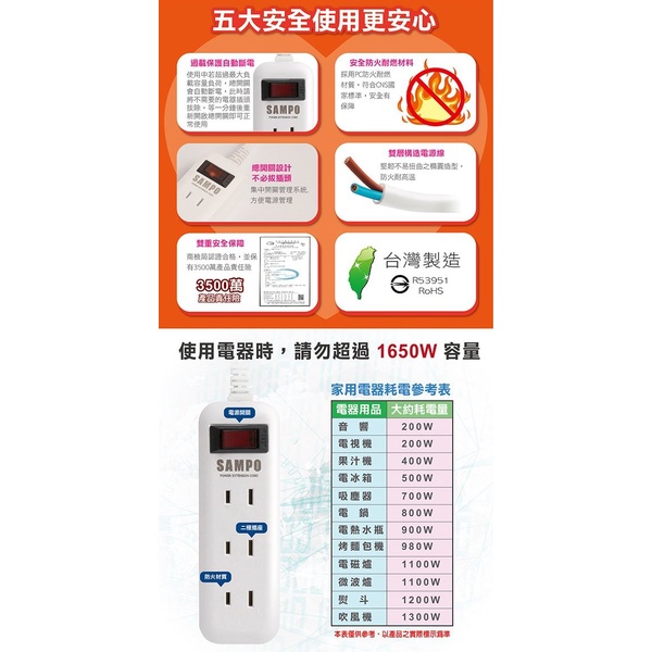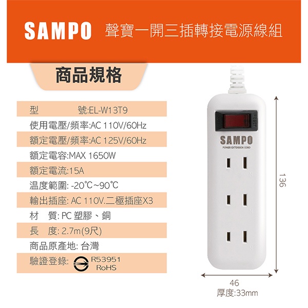 【光南大批發】SAMPO聲寶 2P*過載保護延長線1開3插(1.8M/2.7M)EL-W13T6 / EL-W13T9