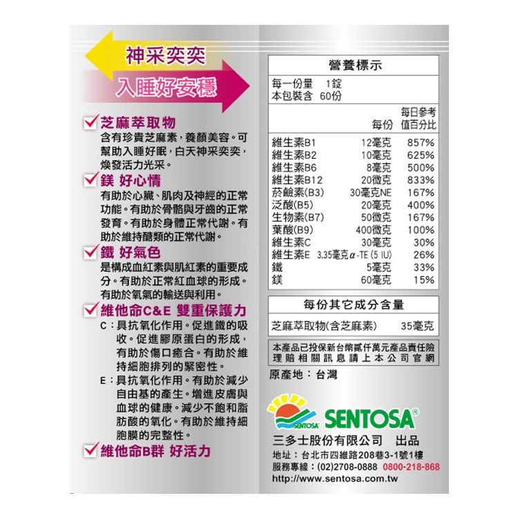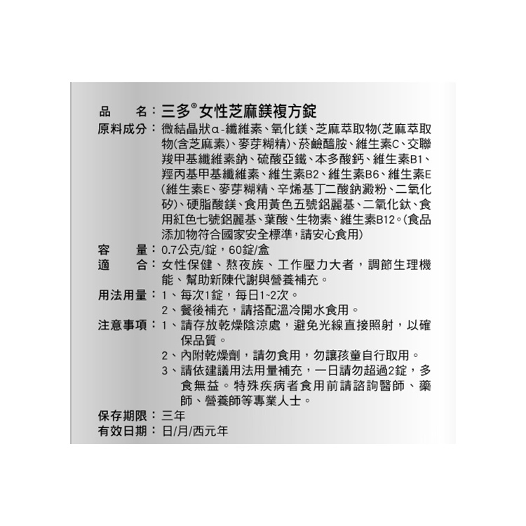 三多 SENTOSA 女性芝麻鎂複方錠 (60錠/盒) 鐵、維他命B群 憨吉小舖
