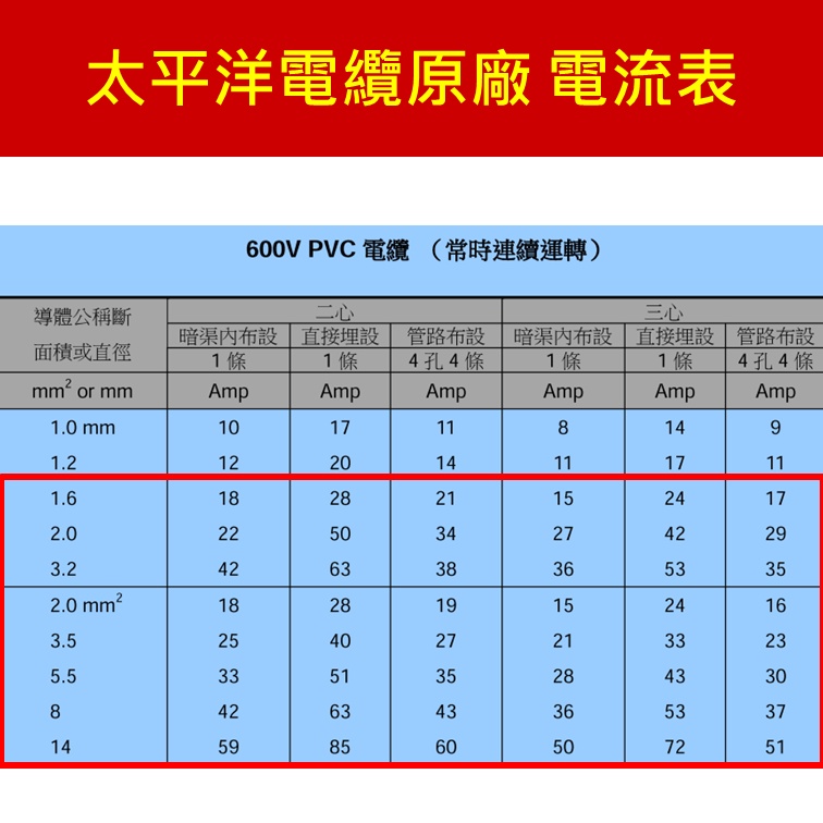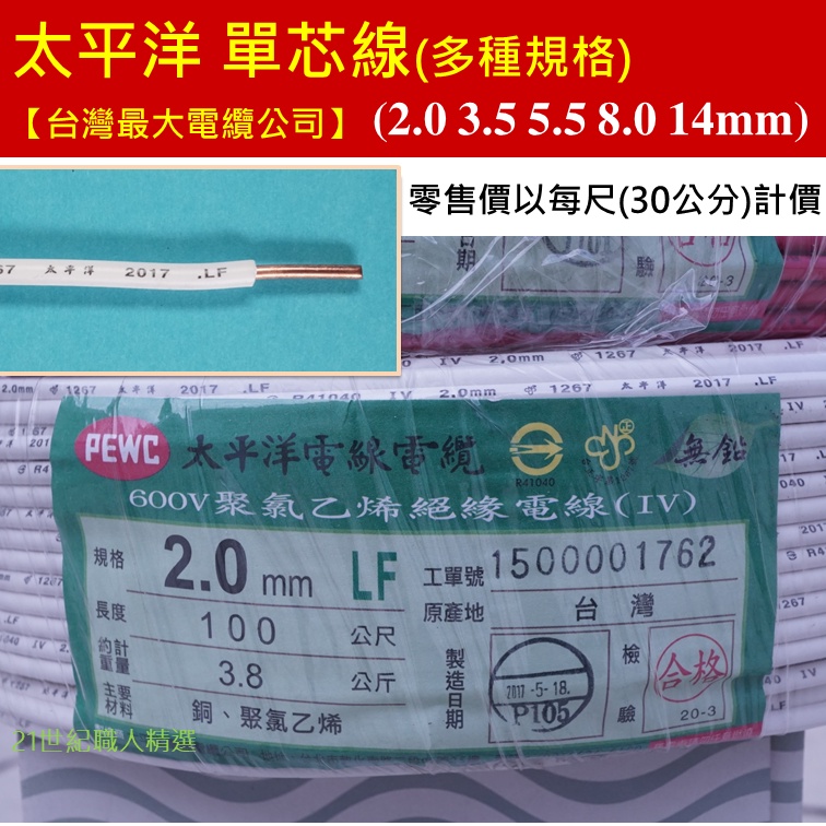 【台灣最大電纜公司】切售 太平洋電線 1.6 2.0 3.5 5.5 8.0 14mm PVC 單心線 單芯線 實芯線