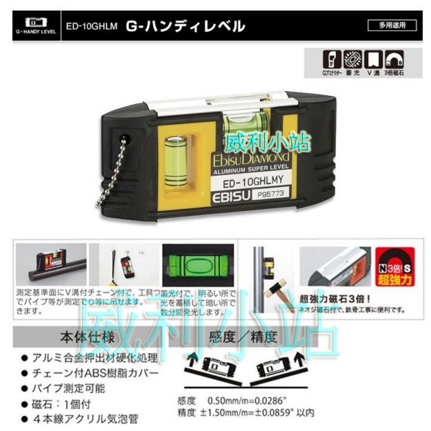 【威利小站】日本 ED-10GHLMY 防震強磁水平尺 附磁 日本製造 壓克力 夜光水平尺 多角度 水平儀 氣泡尺