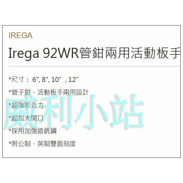 【威利小站】西班牙 IREGA 92WR 10"/10吋 12"/12吋 管鉗兩用活動板手 工作 拆卸螺絲