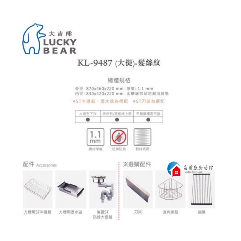 【富爾康】免運•大吉熊不銹鋼水槽KL-9487大提87公分單槽~髮絲紋厚度1.1 洗菜盆洗手盆水池水槽