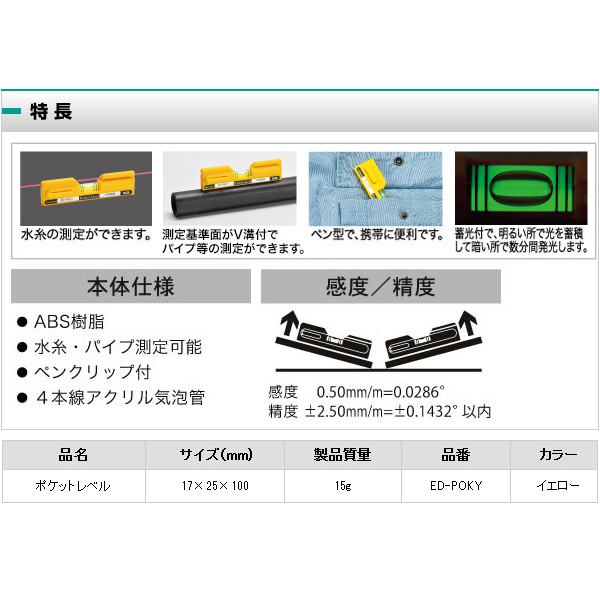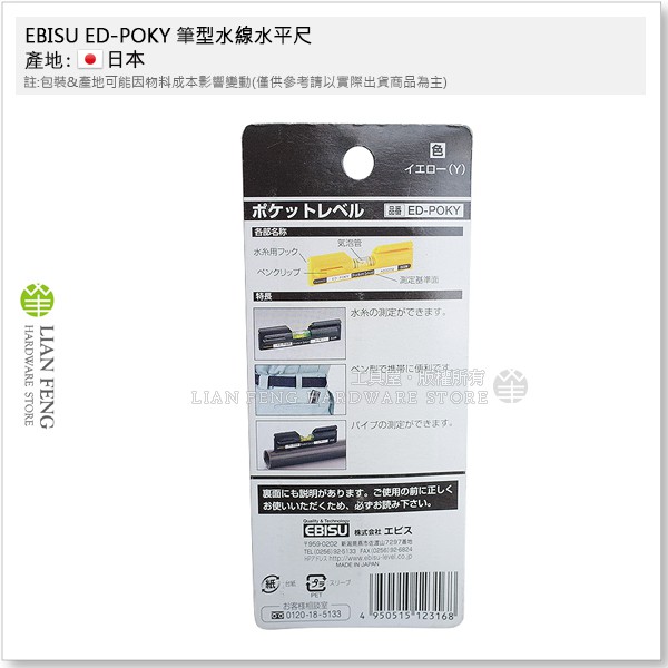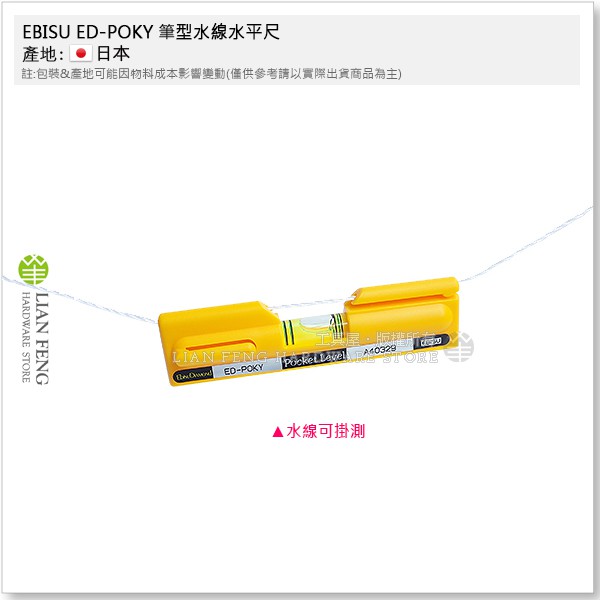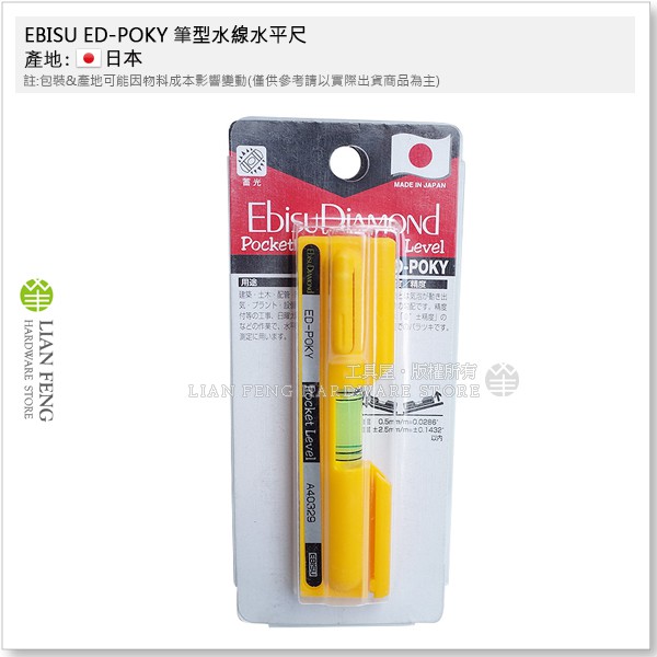 【工具屋】*含稅* EBISU ED-POKY 筆型水線水平尺 惠比壽 4英吋 口袋型水平尺 水平儀測量 4本線 日本製