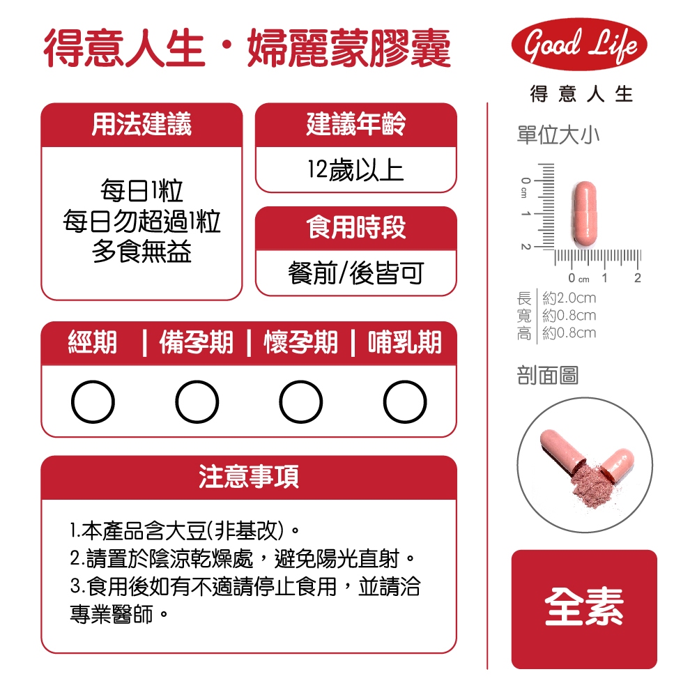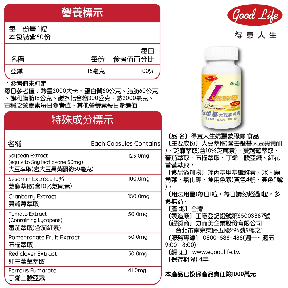 【得意人生】婦麗蒙膠囊(去醣基大豆異黃酮) (60粒/瓶) 蔓越莓/茄紅素/石榴