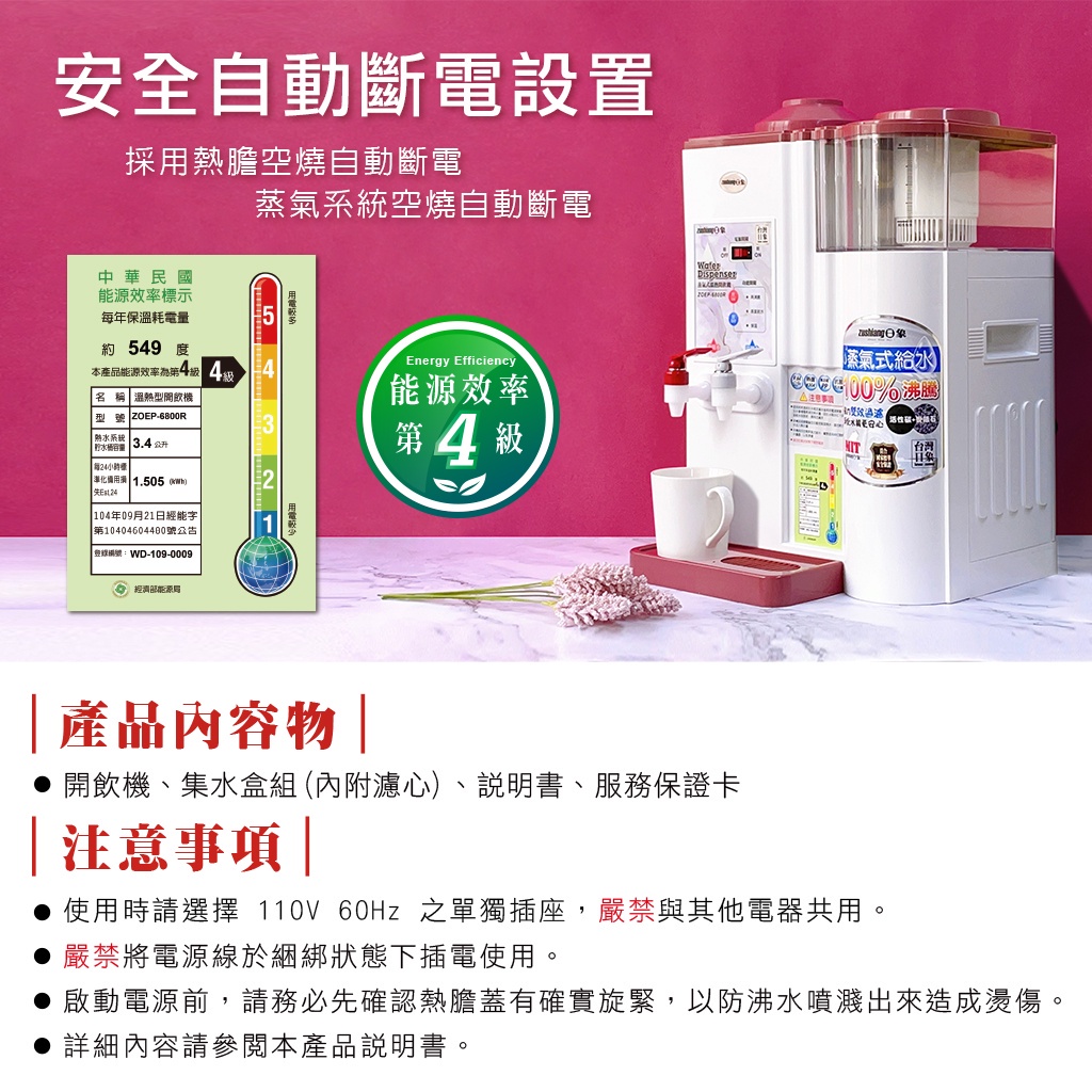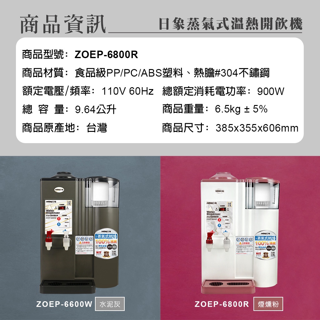 【日象】蒸氣式溫熱濾心開飲機9.64公升 ZOEP-6800R(煙燻粉) 飲水機 蒸氣式給水 台灣製MIT