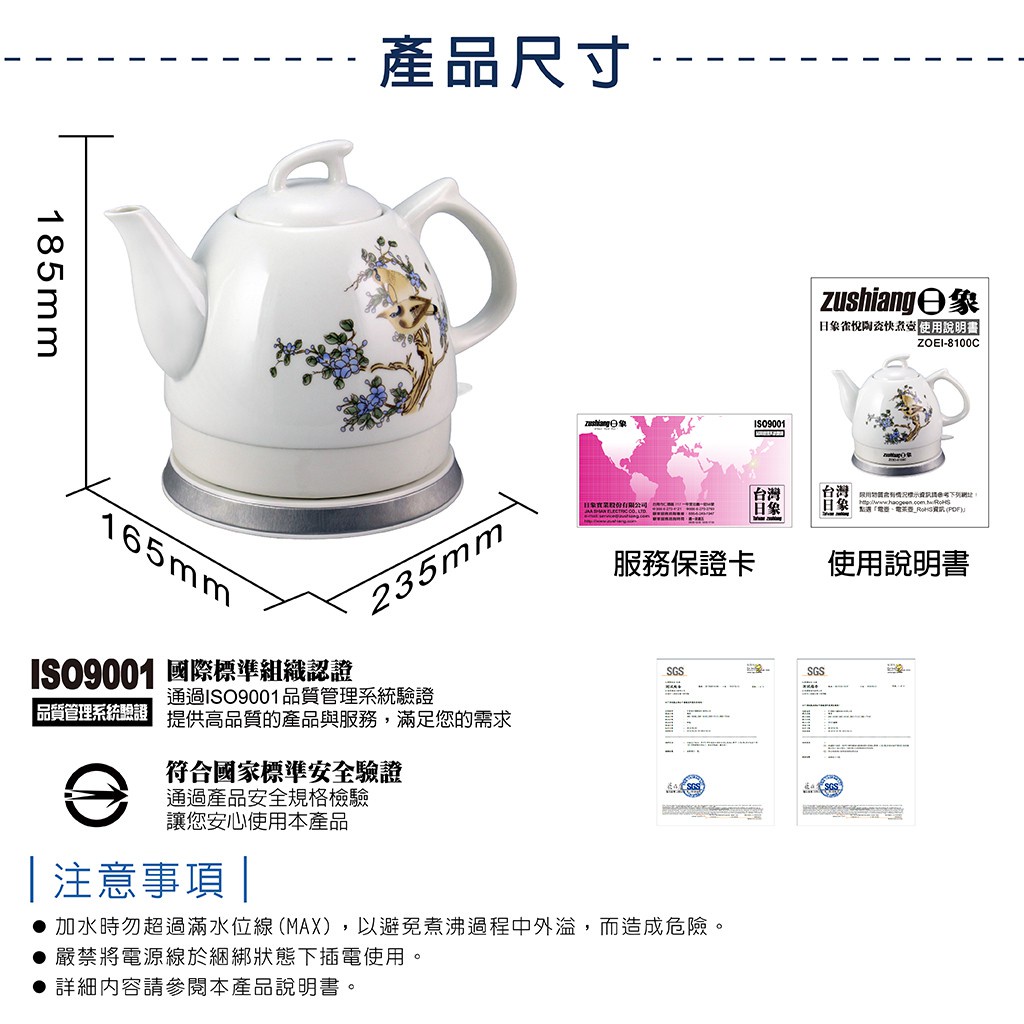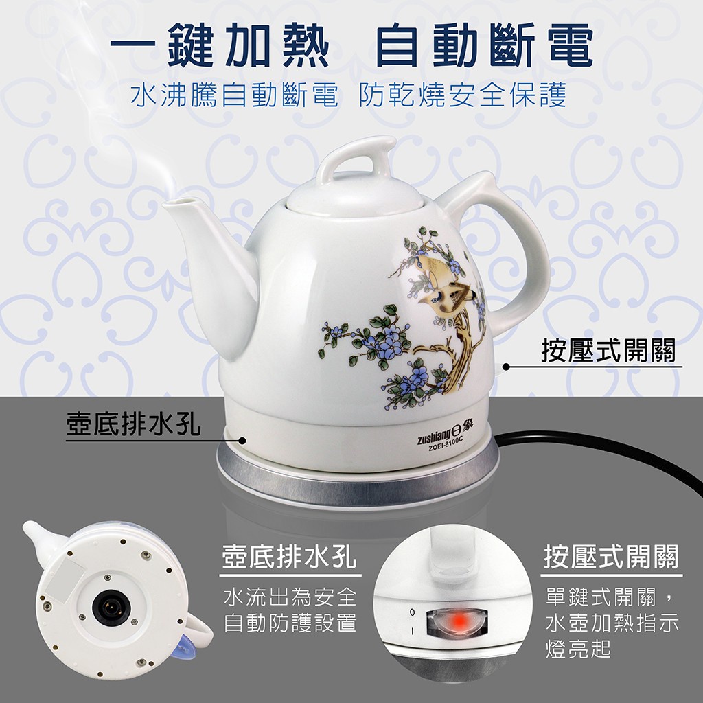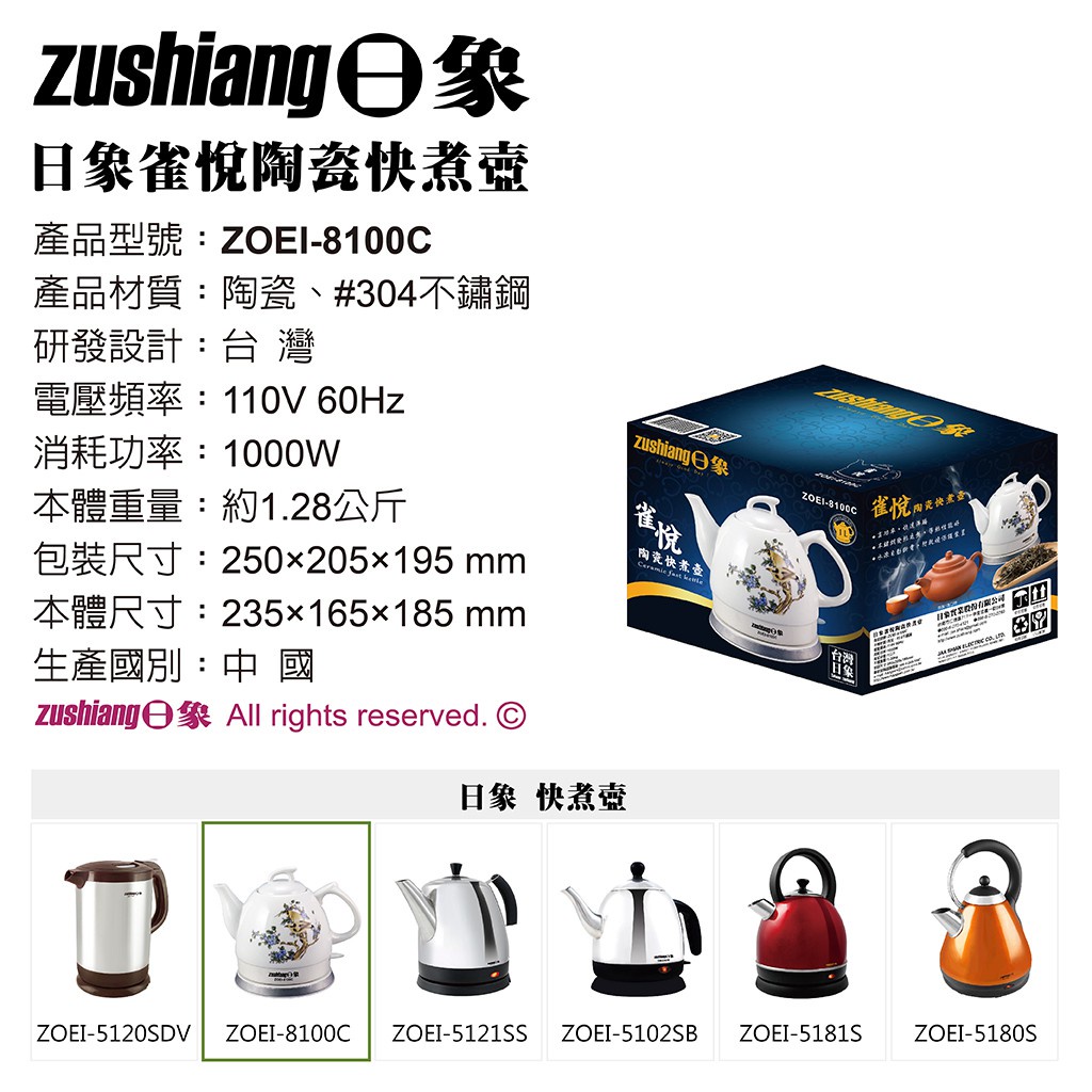 【日象】雀悅陶瓷快煮壺(1.0L) ZOEI-8100C 陶瓷壺 電水壺 電熱水壺