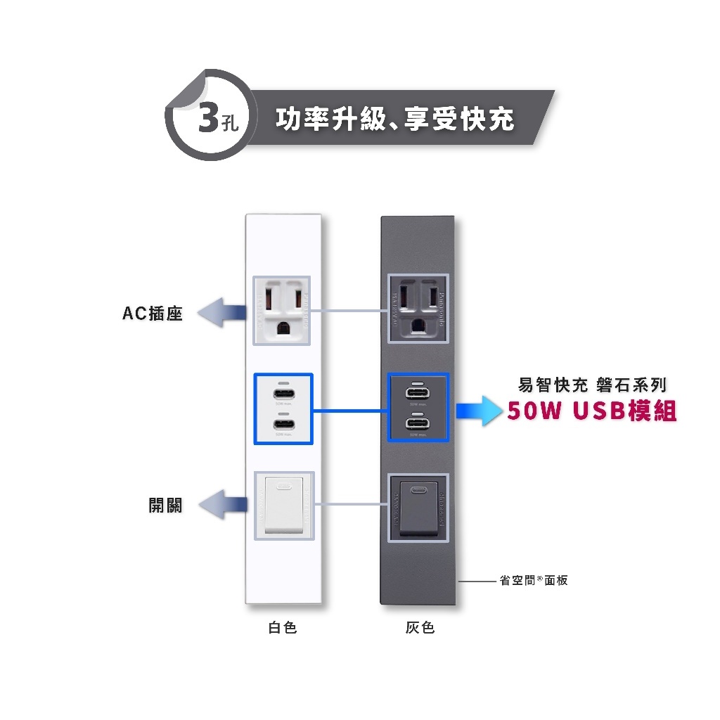 【易智磐石50W+省空間】USB插座 Type-C 氮化鎵快充模組 for 國際牌 省空間 開關 插座 櫥櫃 系統櫃