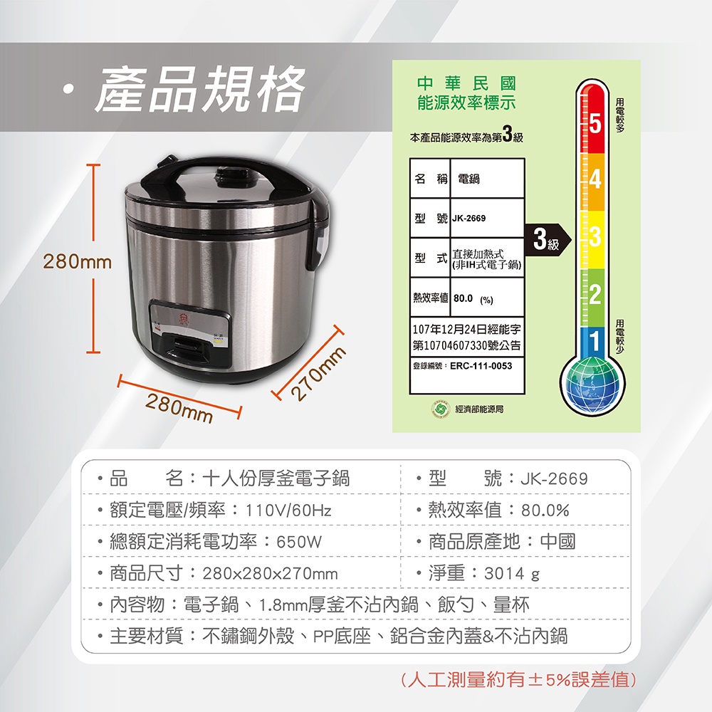 【晶工生活小家電】【晶工】 十人份厚釜電子鍋 JK-2669