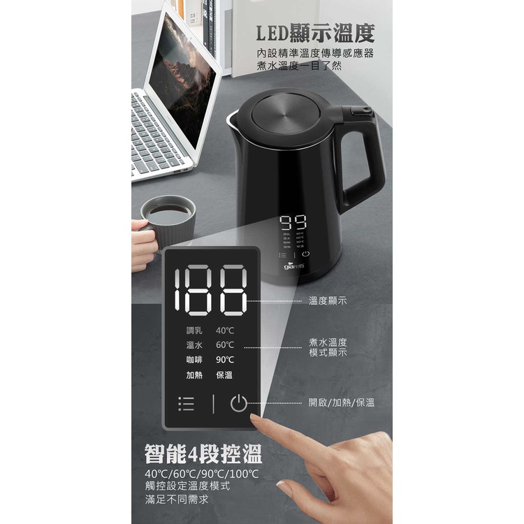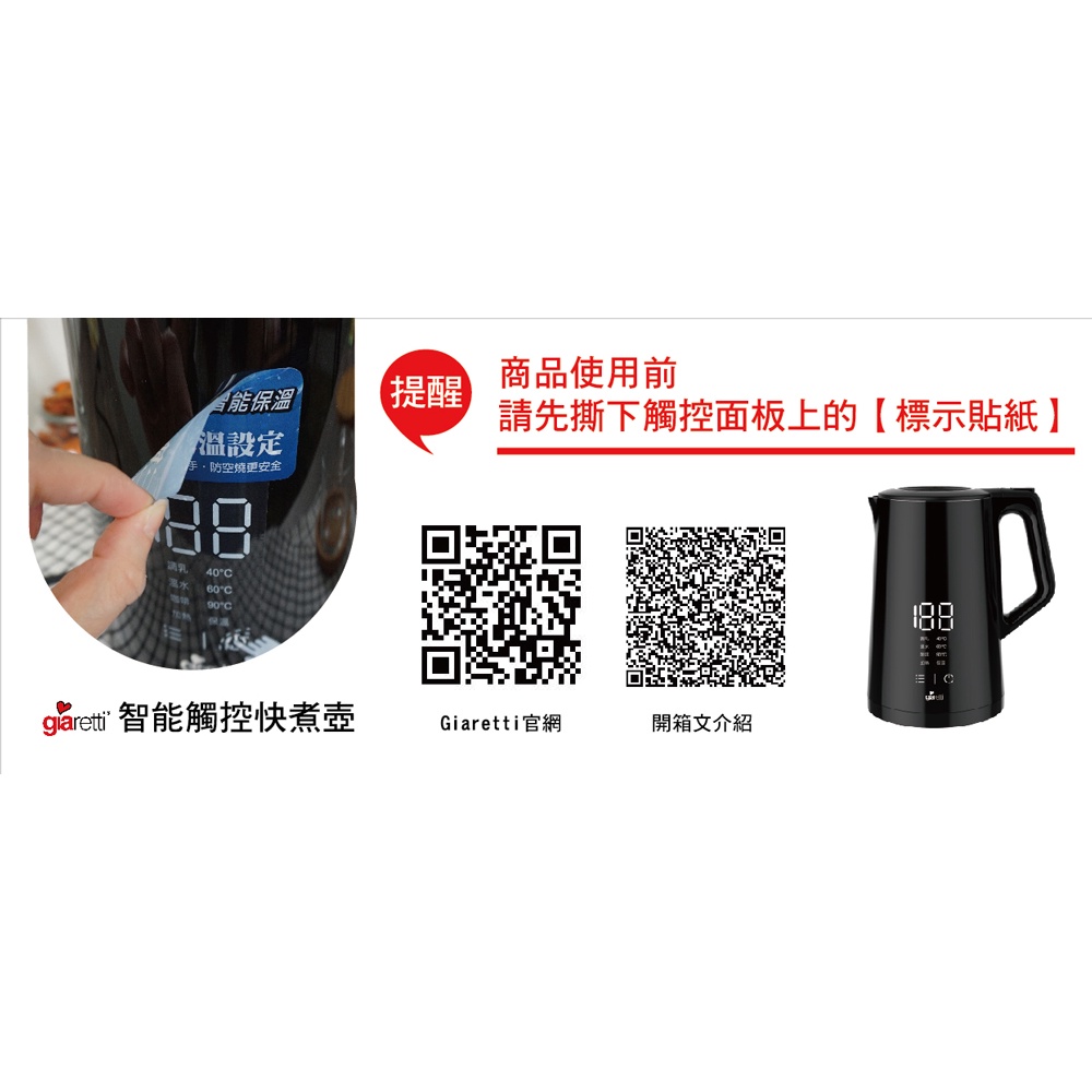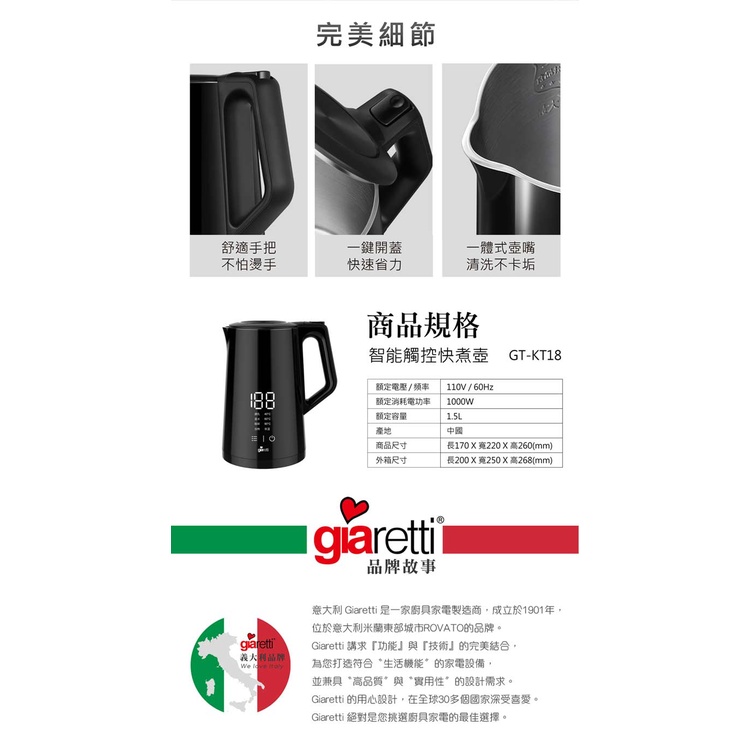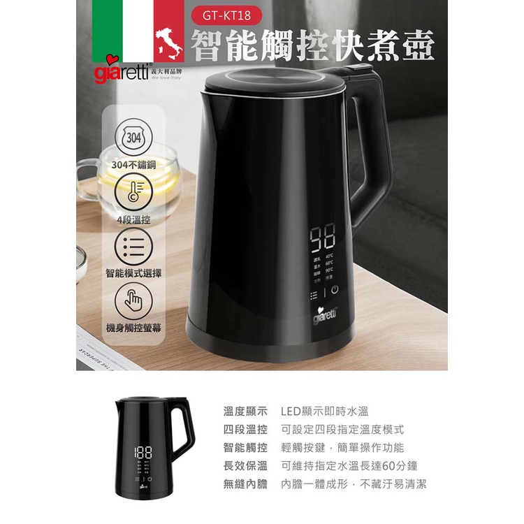【晶工生活小家電】【義大利Giaretti 珈樂堤】智能觸控快煮壺 GT-KT18