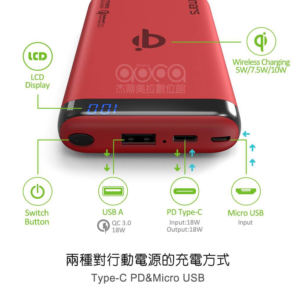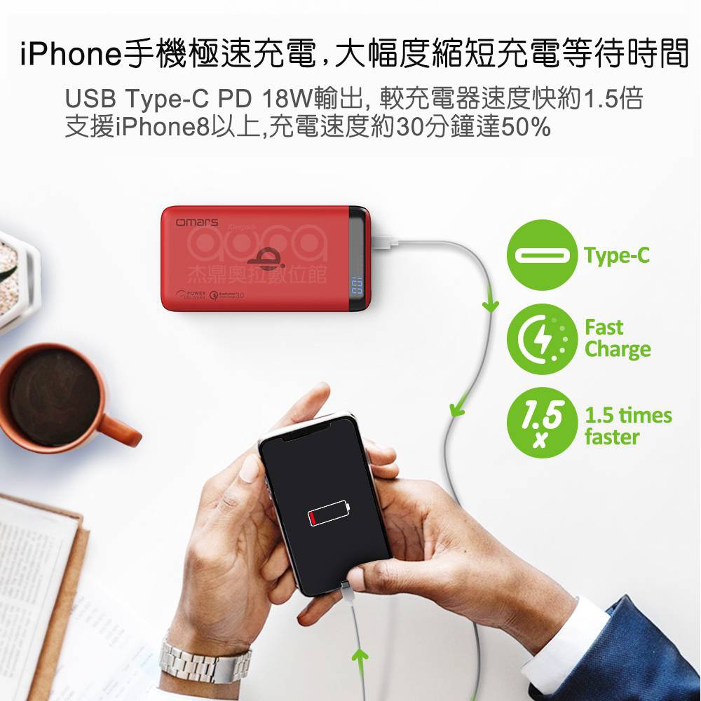 加碼送Type-C充電線 【Omars】無線Qi行動電源-亮眼紅 (PD+QC3.0快充,10000mAh)【杰鼎奧拉】