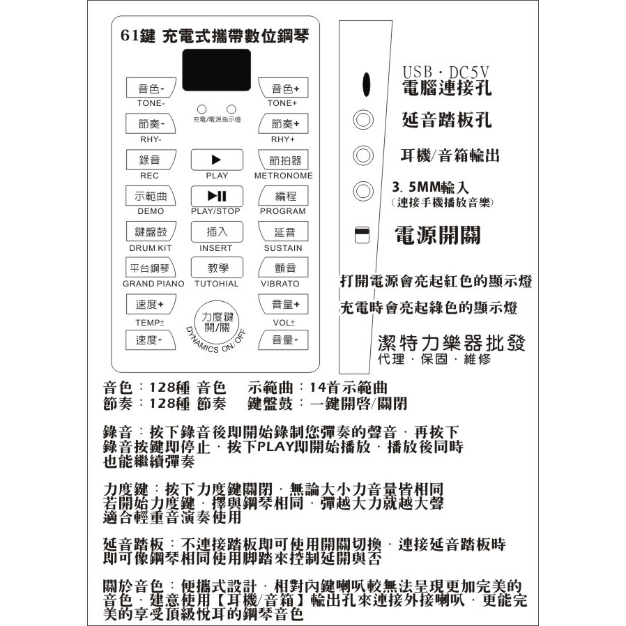 【潔特力樂器批發】現貨.61鍵充電攜帶式電鋼琴/電子琴●贈全配還有表演擴音音箱●實心琴鍵.鋼琴觸感●戶外表演 節禮物