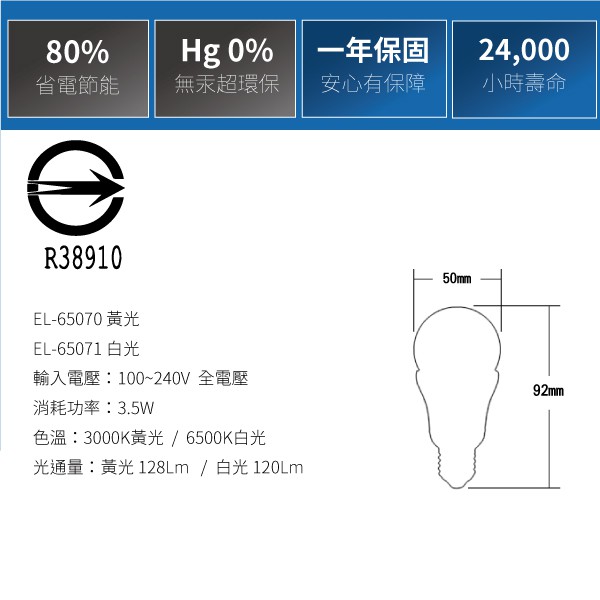 【省電首選】億光超節能LED燈泡3.5W全電壓E27球泡EL-65070☆奇恩舖子Everlight吳念真推薦 節能標章