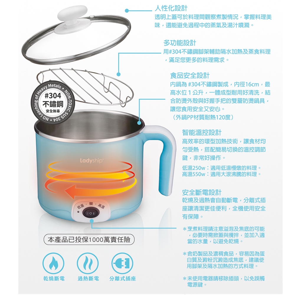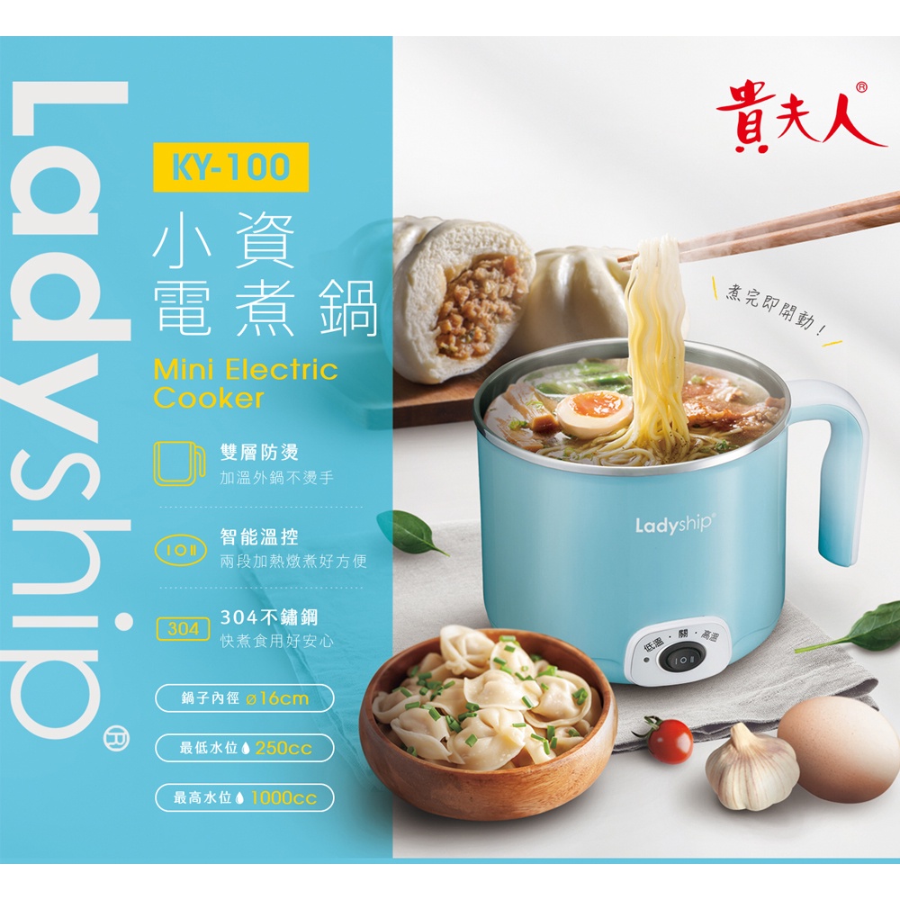 【貴夫人】KY-100 快煮鍋 304不鏽鋼 電煮鍋 附蒸架 小資 電煮壺 泡麵鍋 電火鍋 2段溫控 燉蒸煮方便鍋