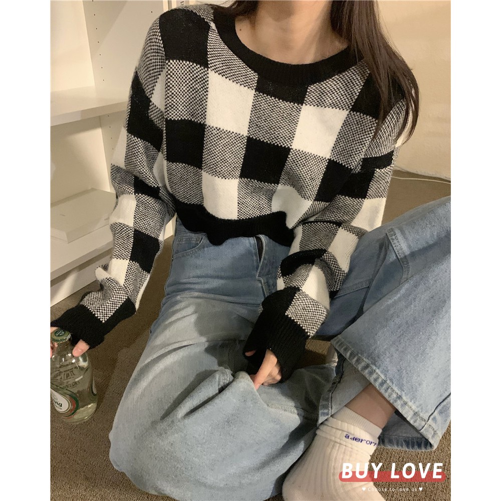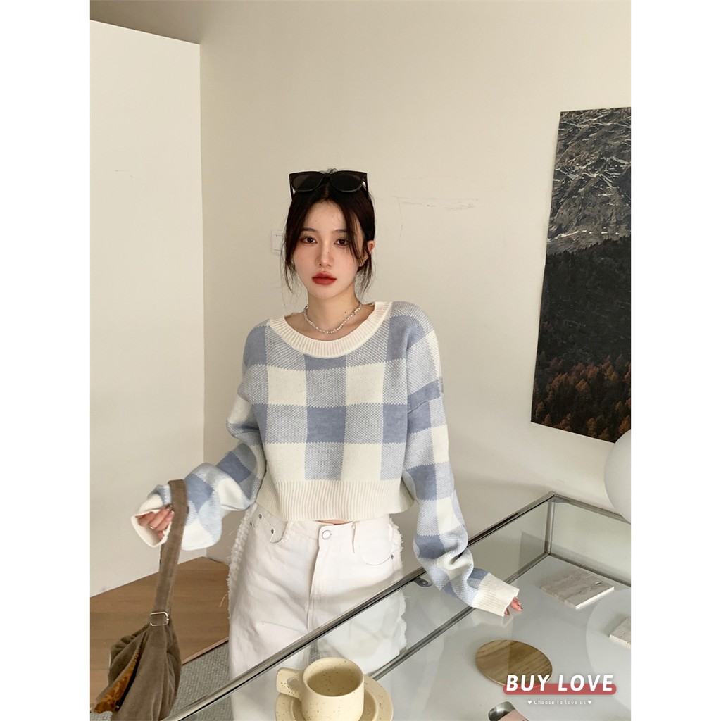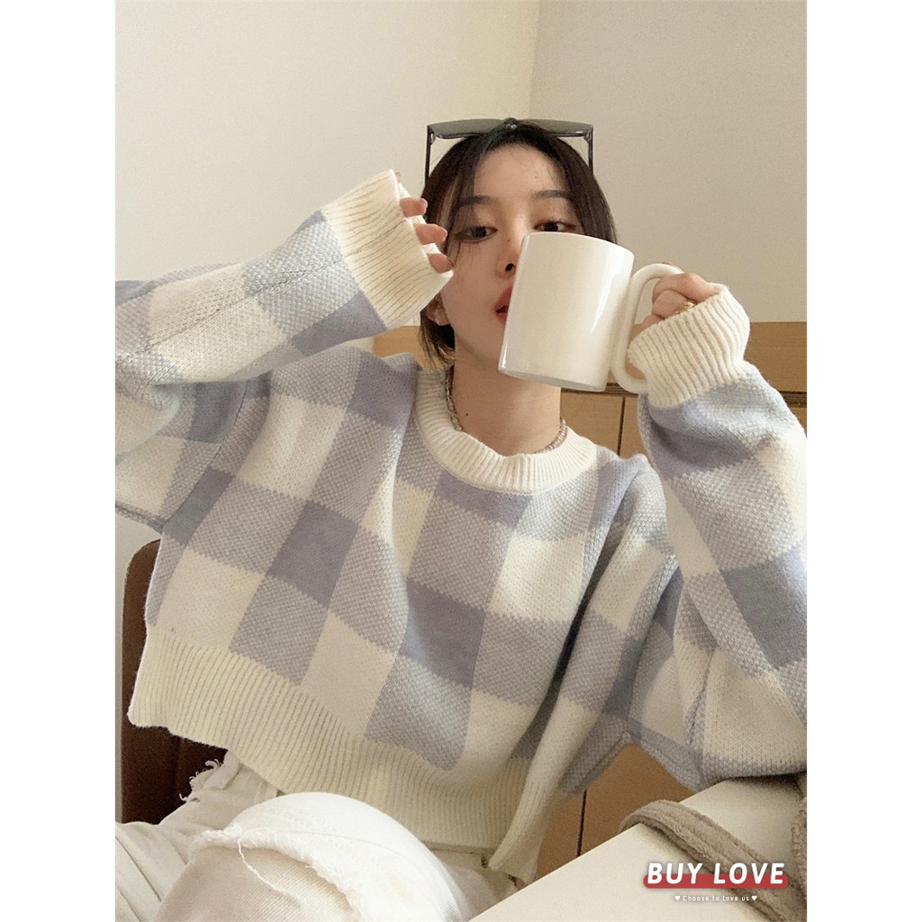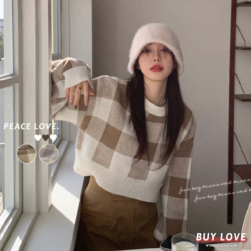 【買到戀愛】 隔日到貨 女裝 實拍撞色圓領大格紋短版毛衣 長袖 針織衫 格紋女裝上衣【G88152】