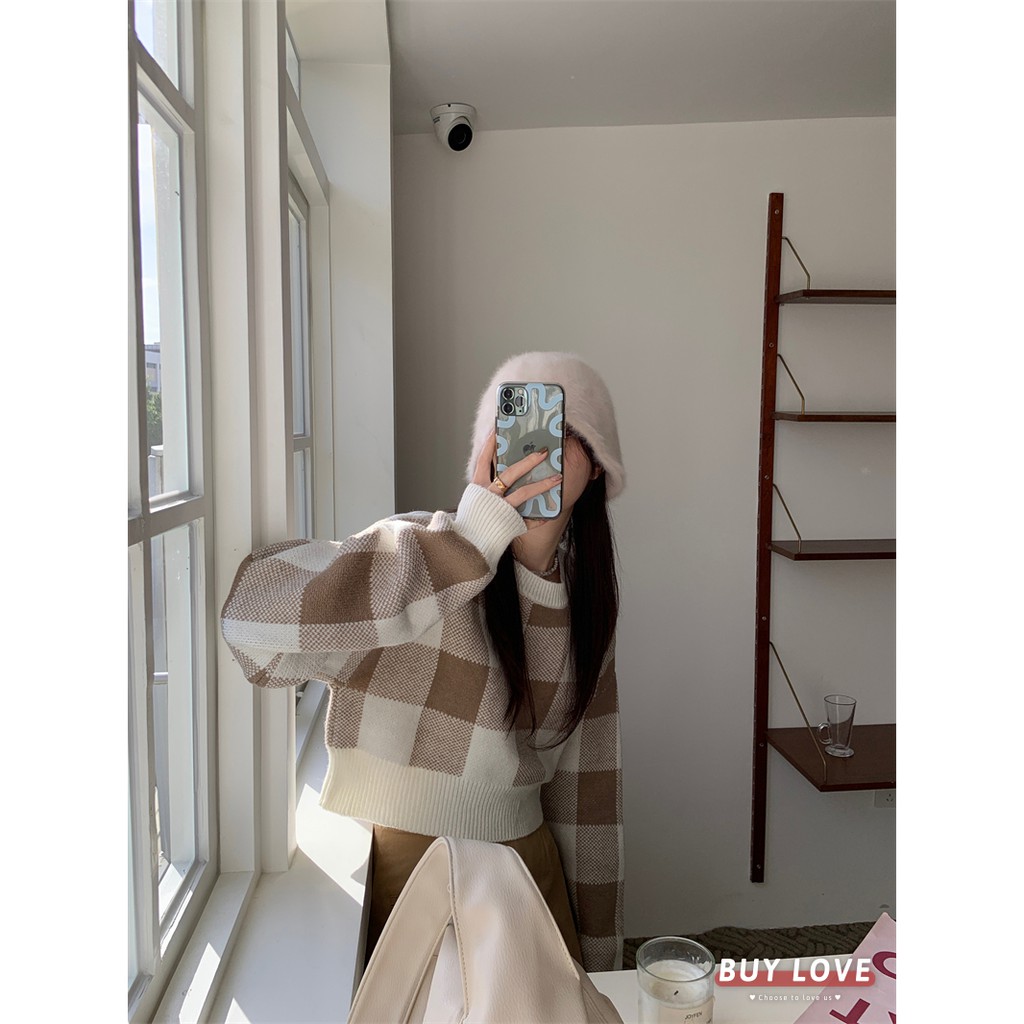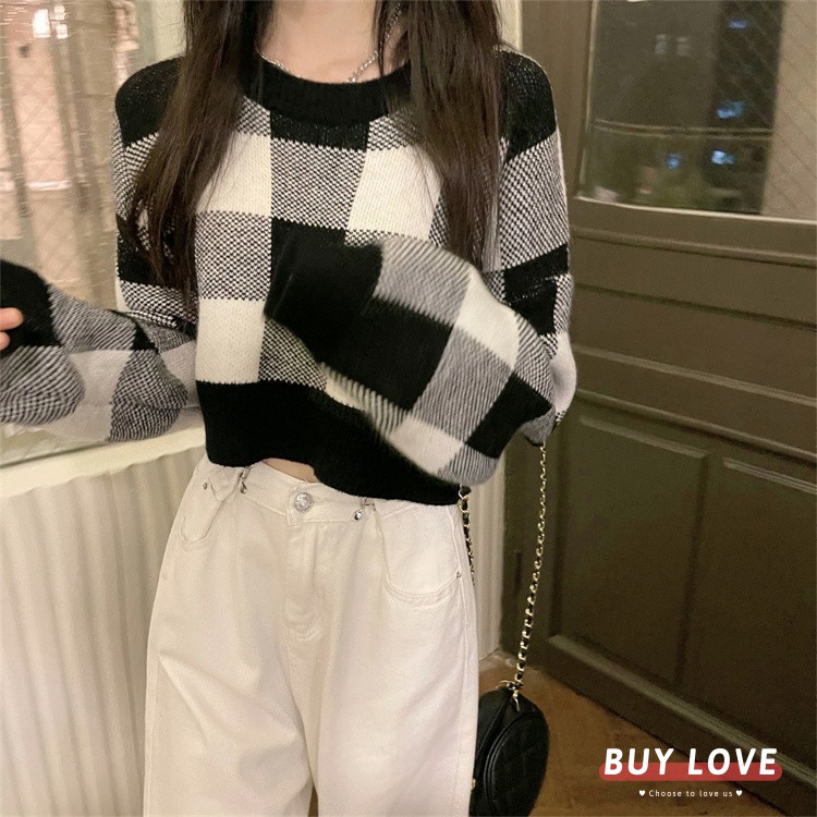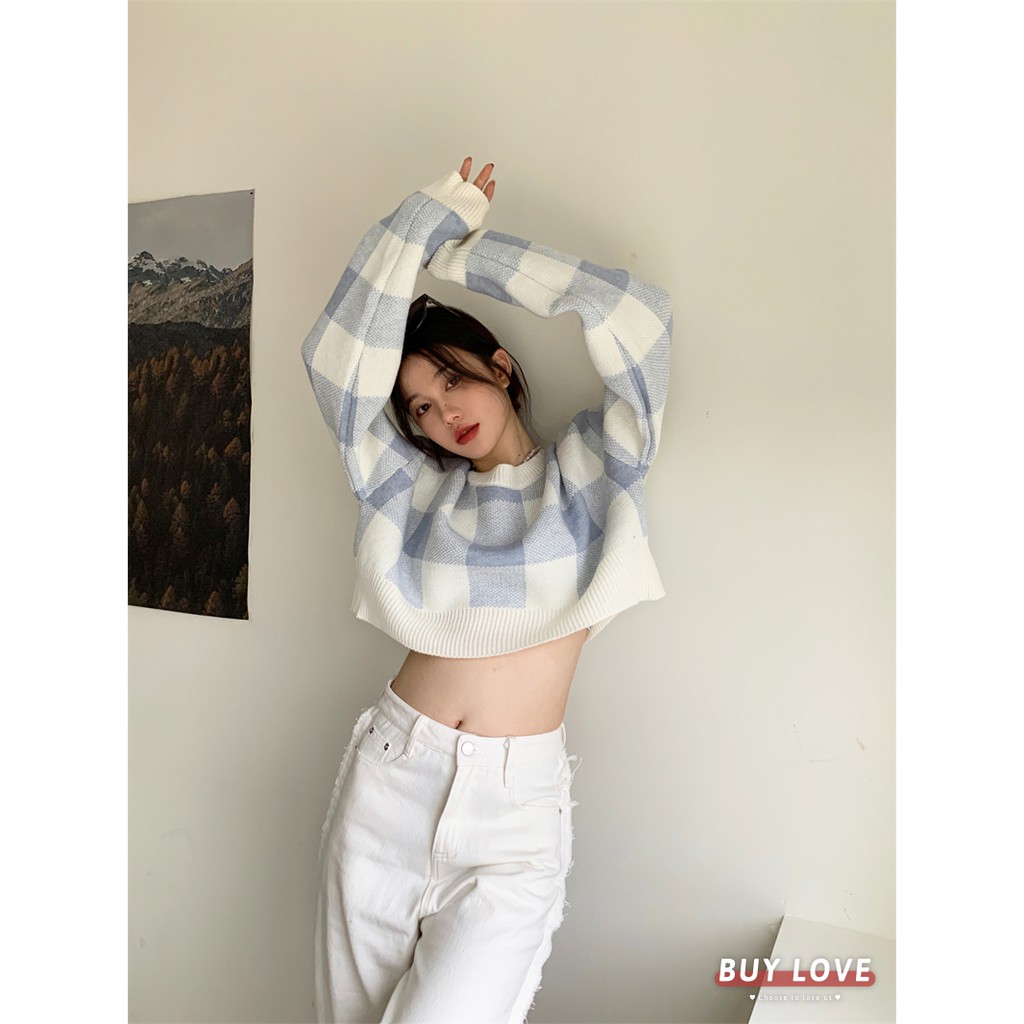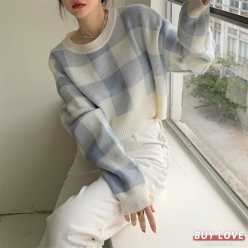 【買到戀愛】 隔日到貨 女裝 實拍撞色圓領大格紋短版毛衣 長袖 針織衫 格紋女裝上衣【G88152】