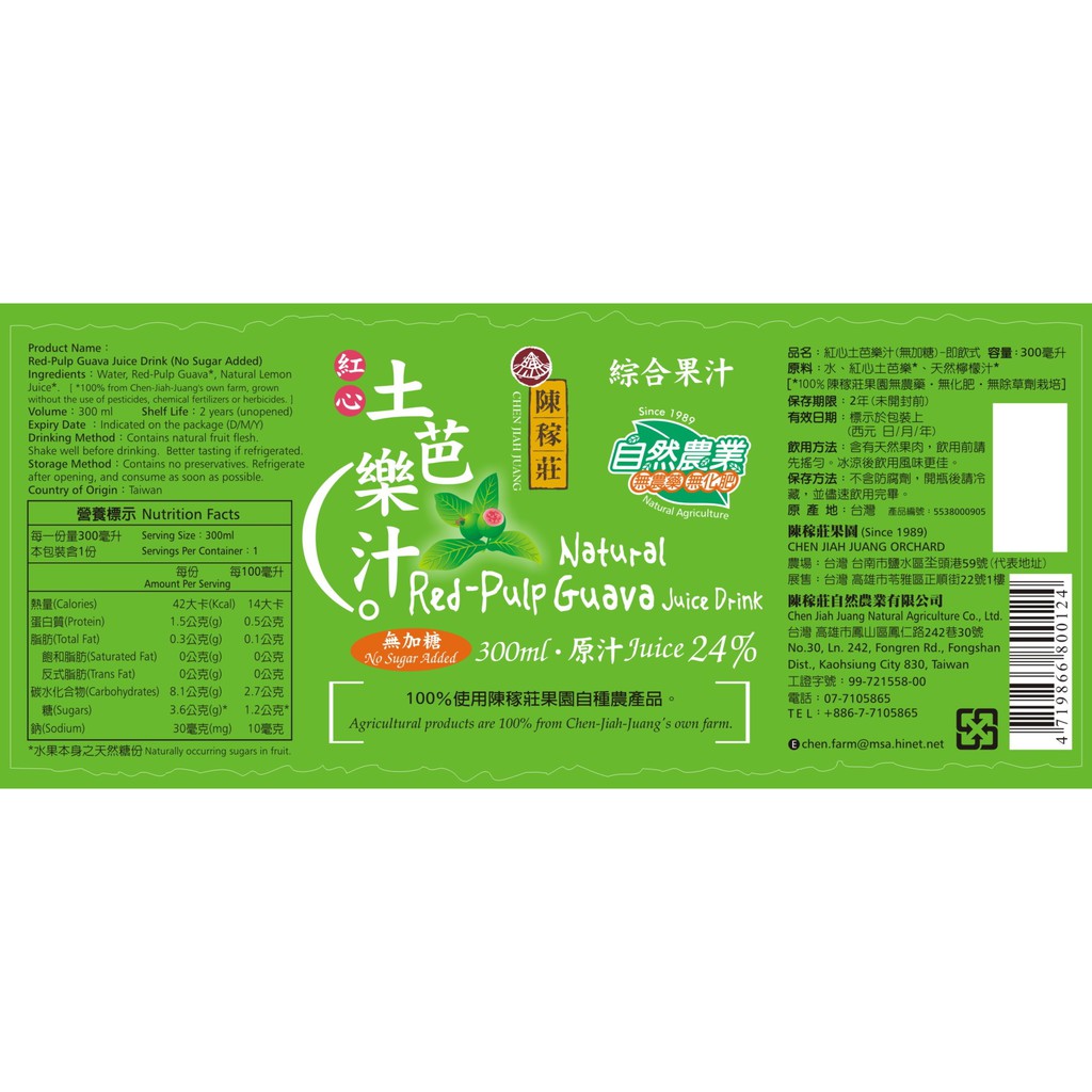 【陳稼莊】紅心土芭樂汁(無加糖)-即飲式 300ml/瓶