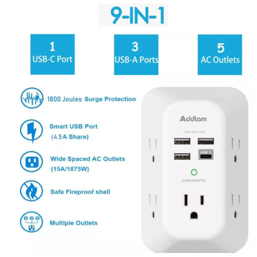 【隔日配】全新 美國 Addtam USB-C 壁式充電器 夜燈 3A 5插座 4USB 電湧保護 延長線
