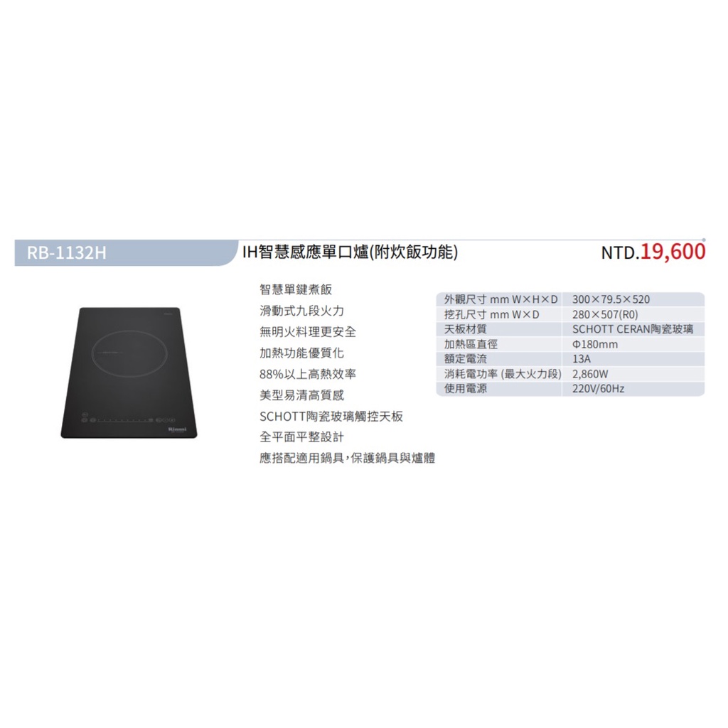 【鵝媽媽】6期0利率☆10%蝦幣☆送標準安裝☆林內牌 RB-1132H☆單口觸控式IH爐智慧感應爐☆附煮飯功能