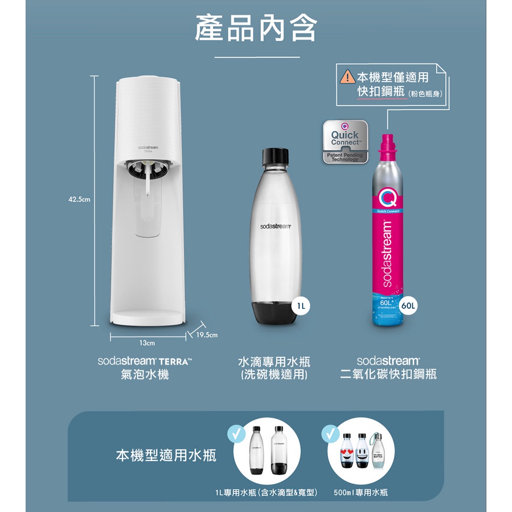 【快扣機型】Sodastream TERRA氣泡水機(藍/白) 送好好帶水瓶+可樂濃縮飲品(效期2026/04)