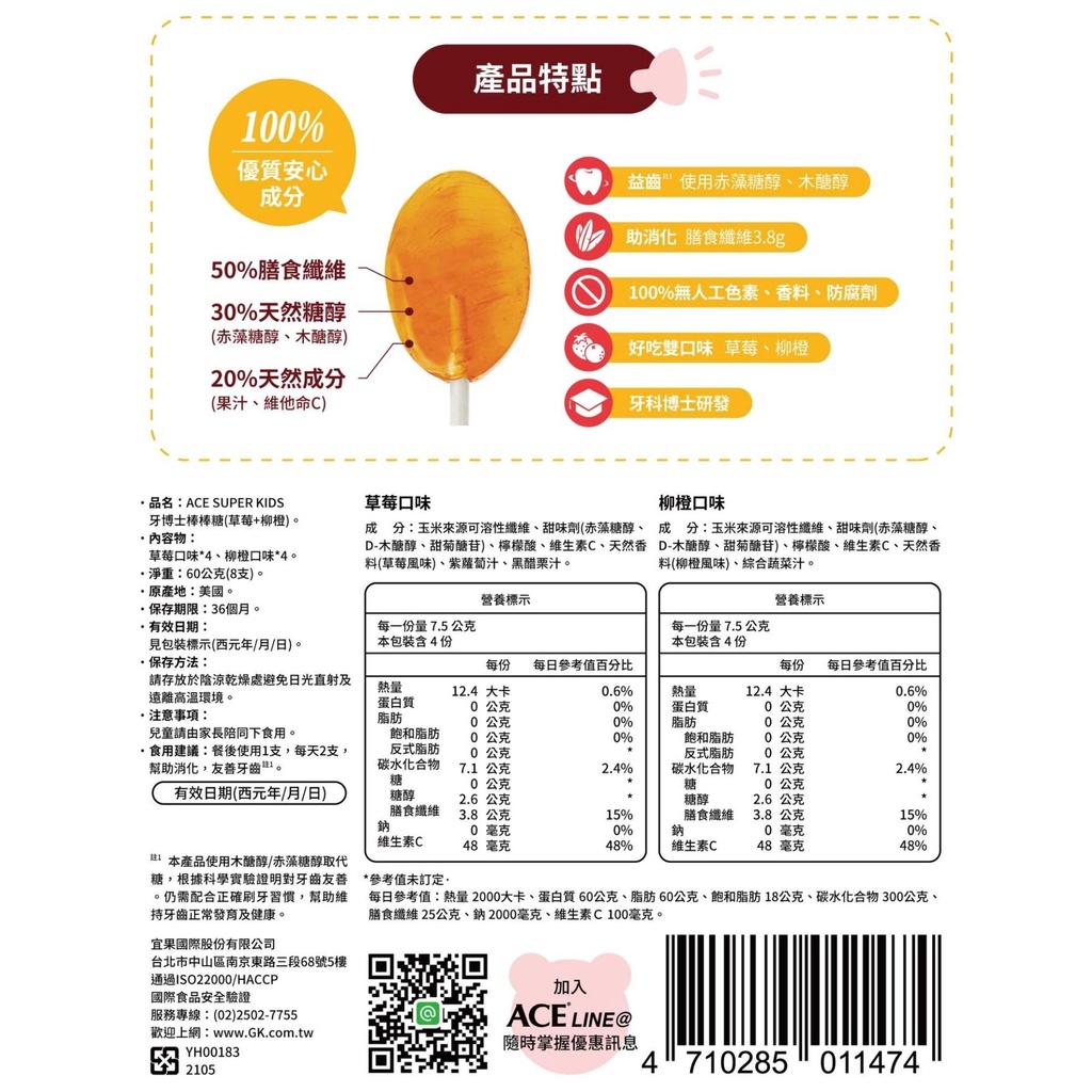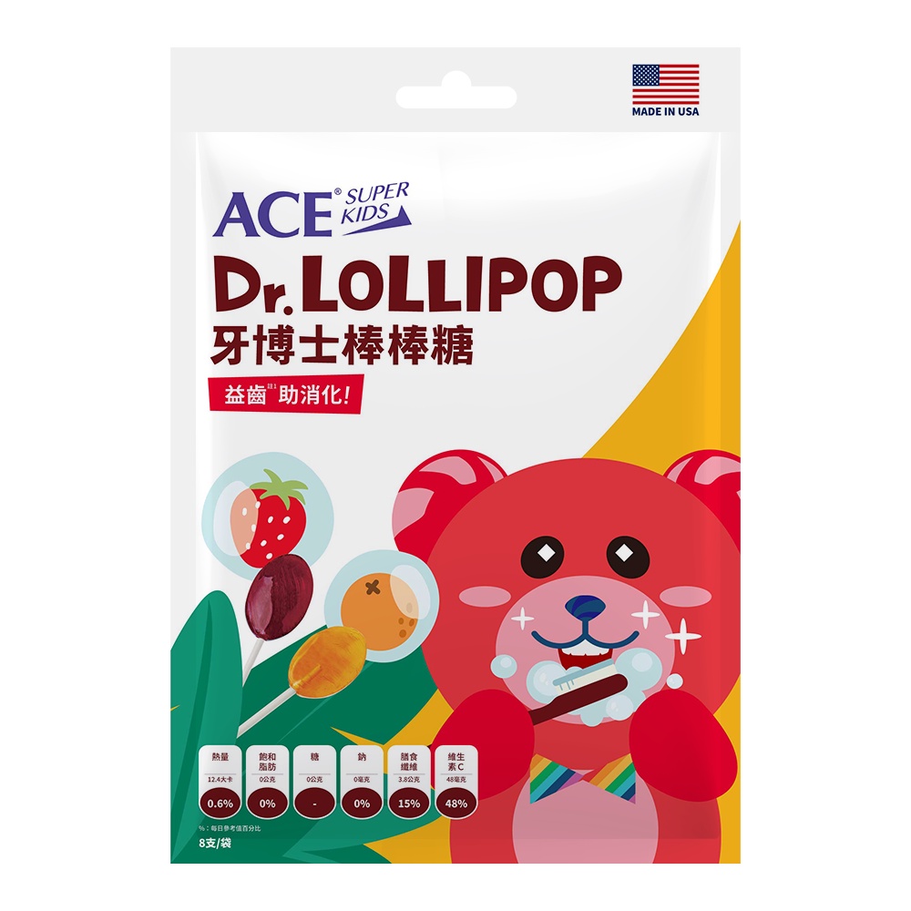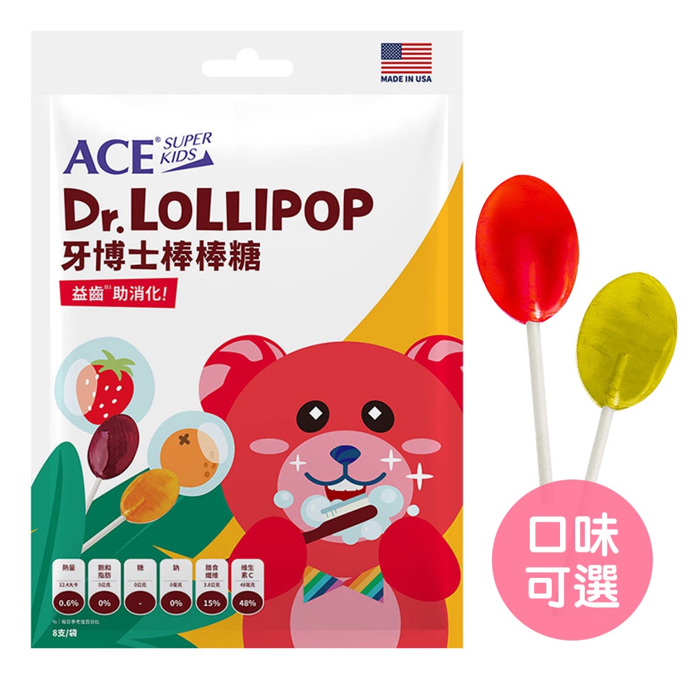 【ACE】 SUPER KIDS 牙博士棒棒糖(8支/袋) 天然糖醇 全素可食 低熱量 維生素C(LAVIDA官方直營)
