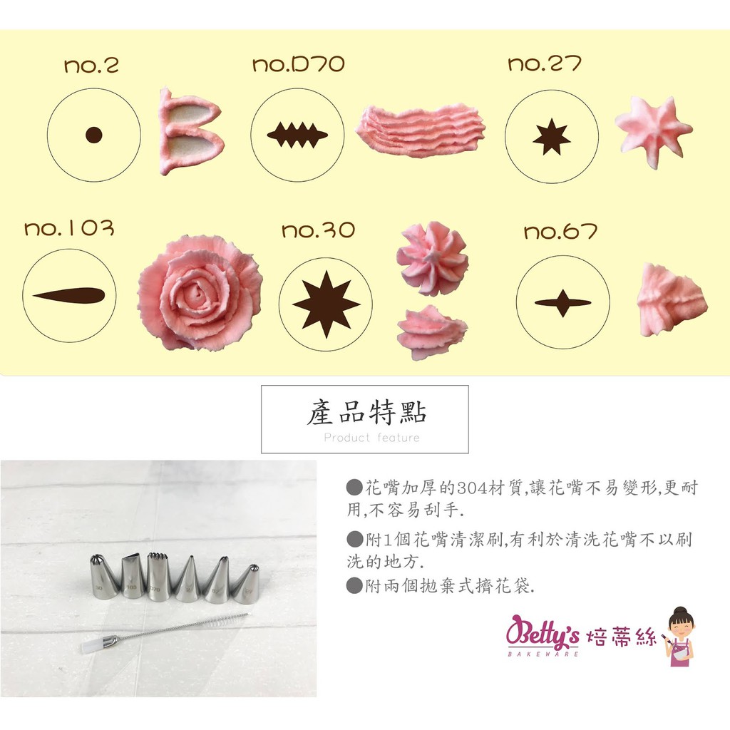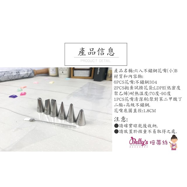 【Betty's焙蒂絲 】 DT7016 6入不鏽鋼花嘴(小)B 擠花嘴 附贈清潔刷頭及擠花袋