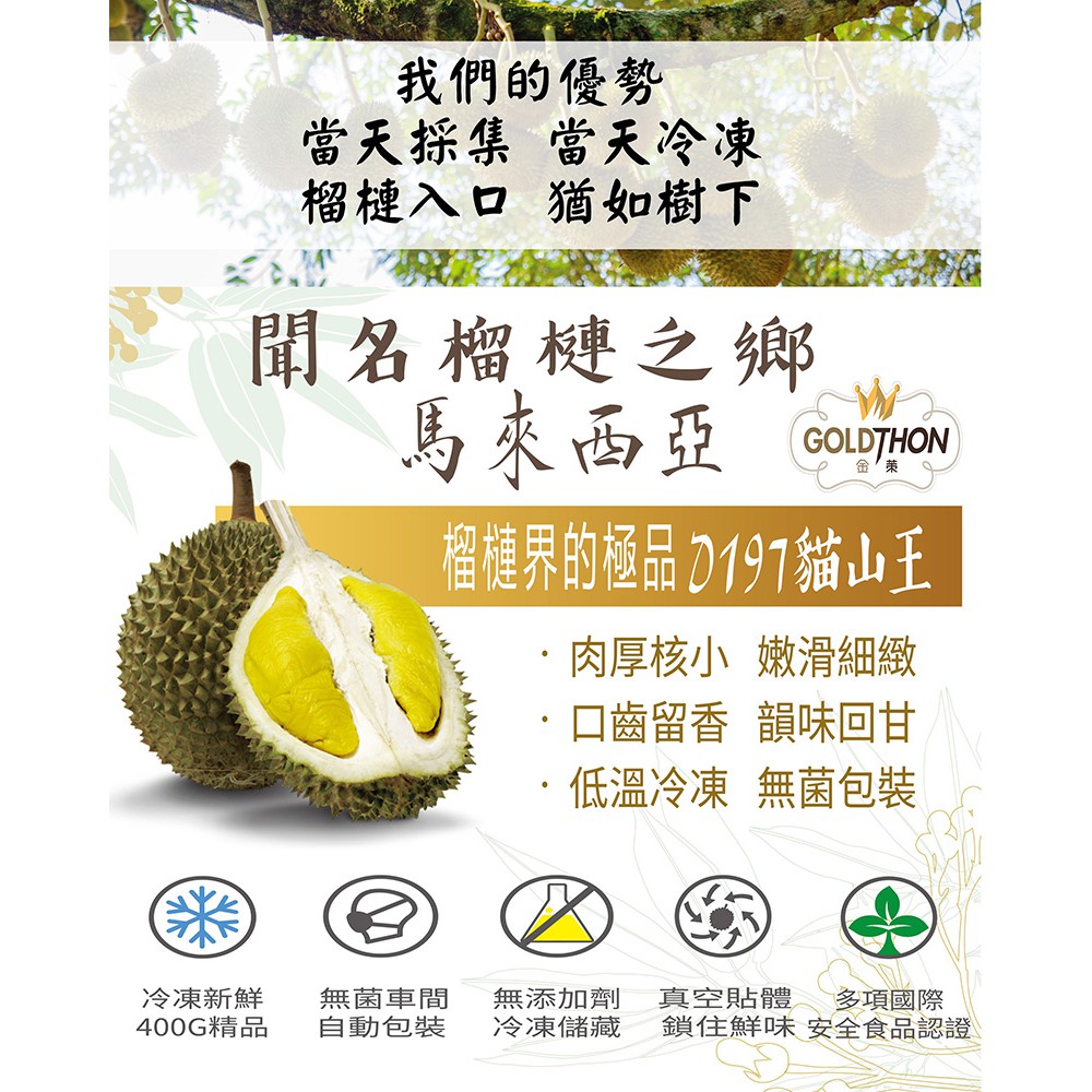 馬來西亞 貓山王 榴槤 盒裝果肉 400克包裝 馬來西亞最佳果園認證 真空3D貼體包裝 清真等級衛生