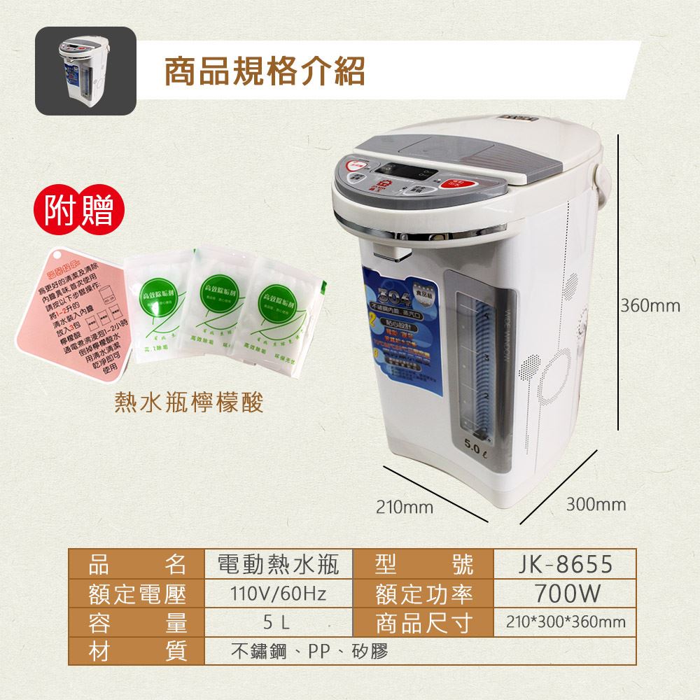 【JINKON晶工】5L 電熱水瓶 JK-8655 熱水瓶 不銹鋼內膽 電動給水 原廠保固