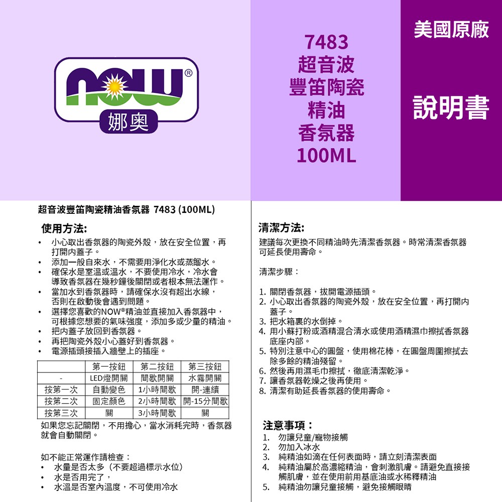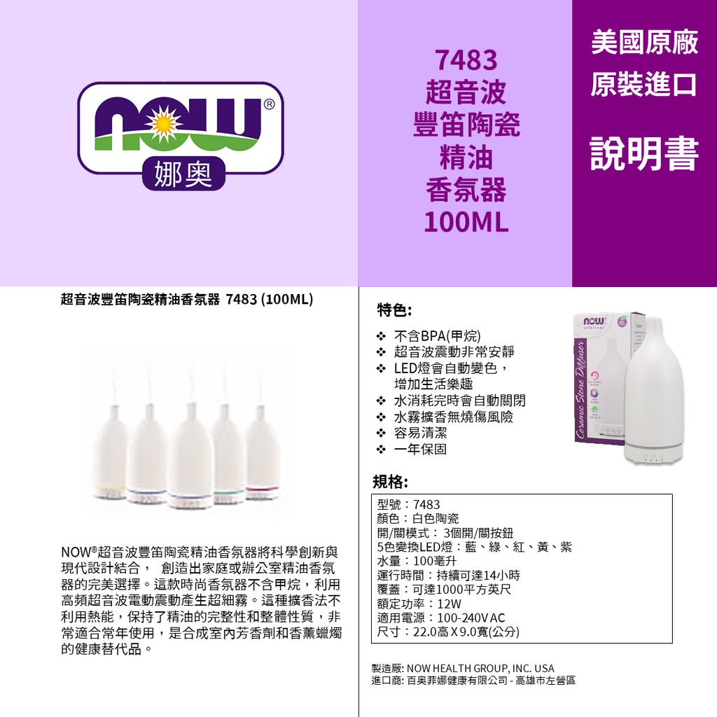 【NOW 娜奧】超音波豐笛陶瓷精油香氛器 100ml~特惠~Now Foods 7483