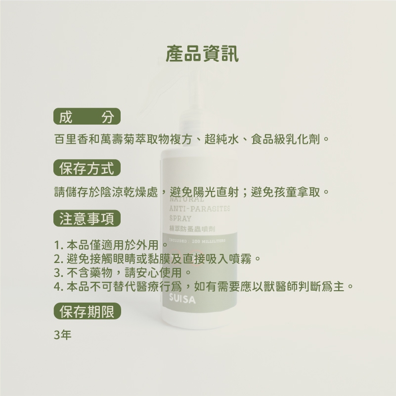 【SUISA】【蘇依沙】 寵物 植萃防蚤蟲噴劑 200ml 對抗蚊蟲/除蟲噴劑/除蚤/除蜱/防蟲/除壁蝨 犬貓適用
