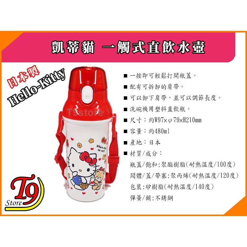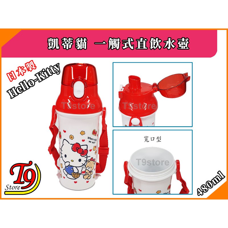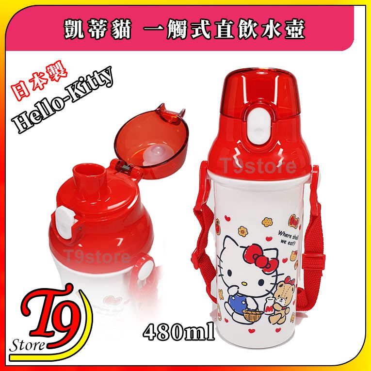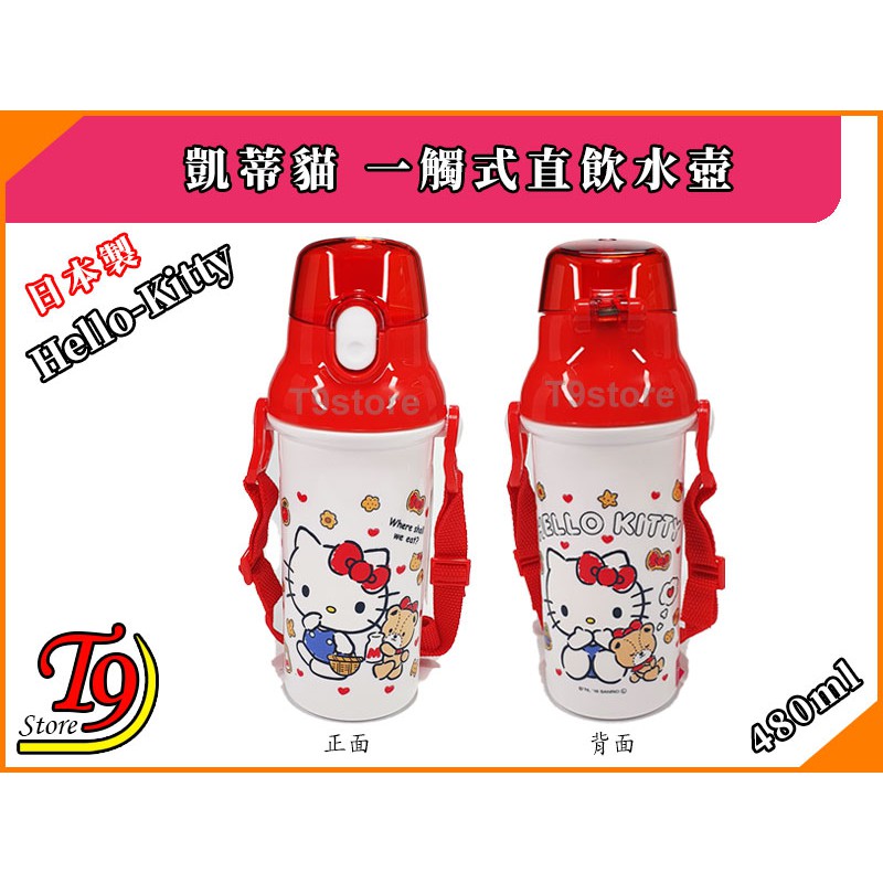 【T9store】日本製 Hello Kitty (凱蒂貓A) 一觸式直飲水壺 水瓶 兒童水壺 (480ml) (有肩帶