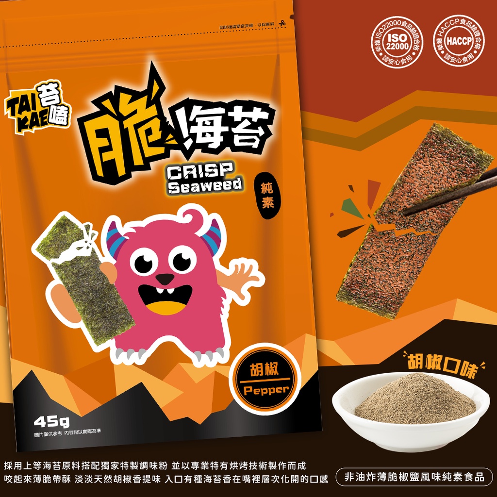 【TAI KAE 苔嗑】 脆海苔(胡椒風味) 45g |雙潔淨標章 辦公室團購(台灣第一家) 口感獨特唯一 烤海苔