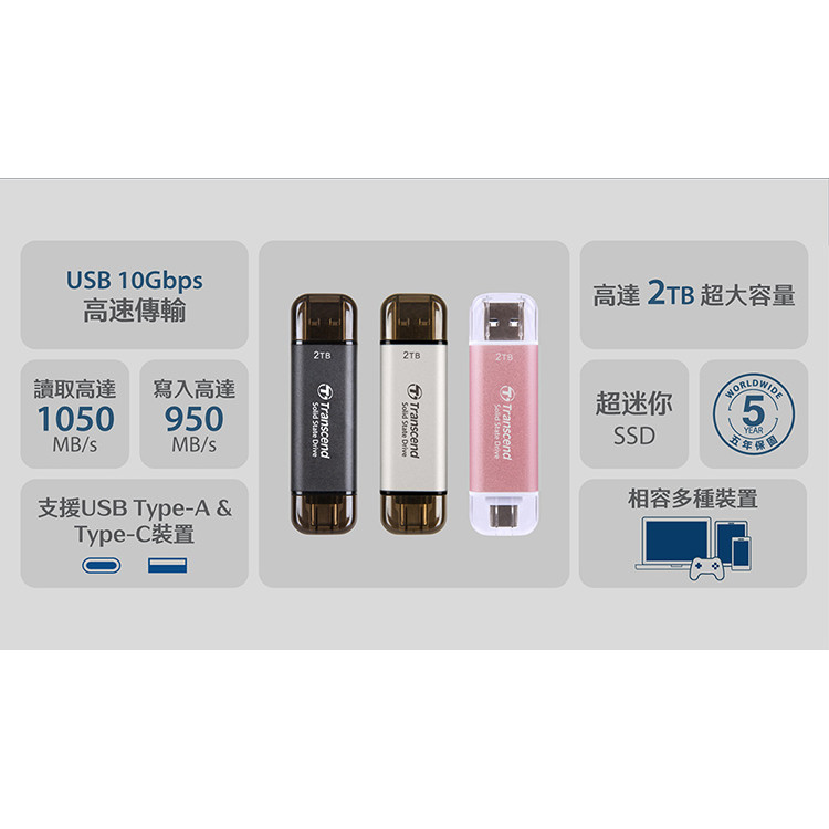 【Transcend 創見】ESD310C 1TB USB3.2 雙介面固態行動碟-太空黑
