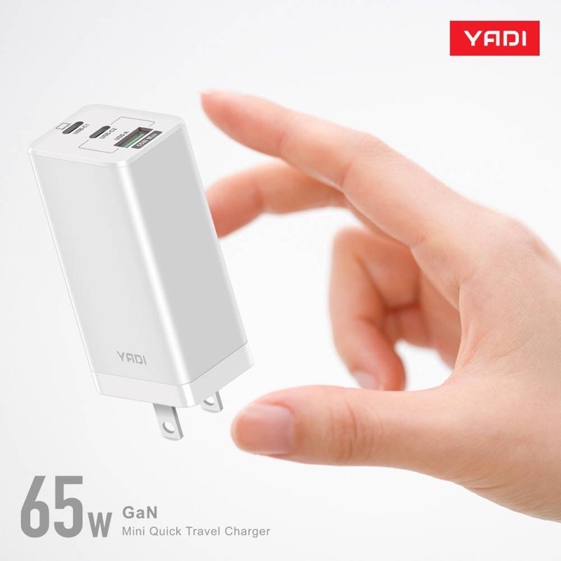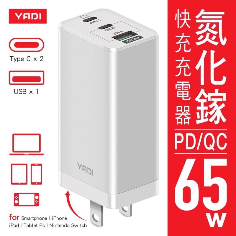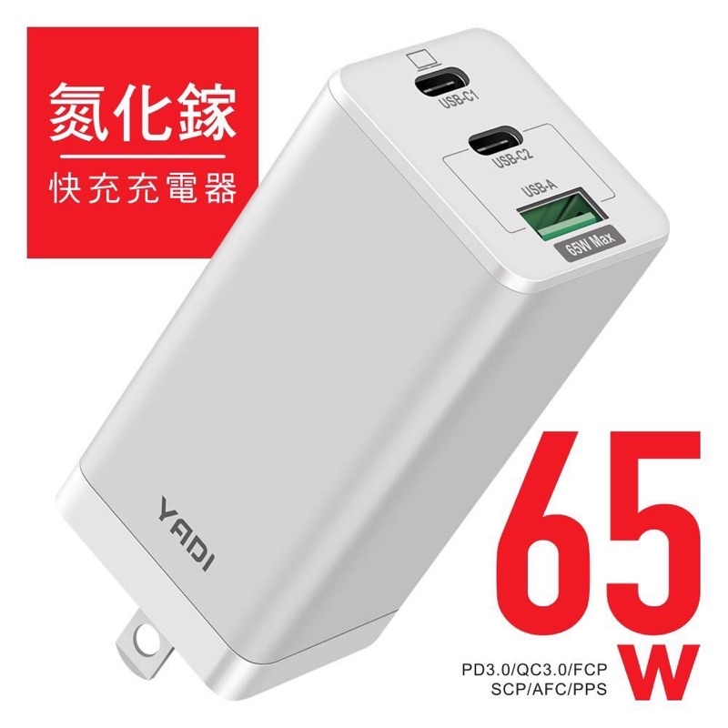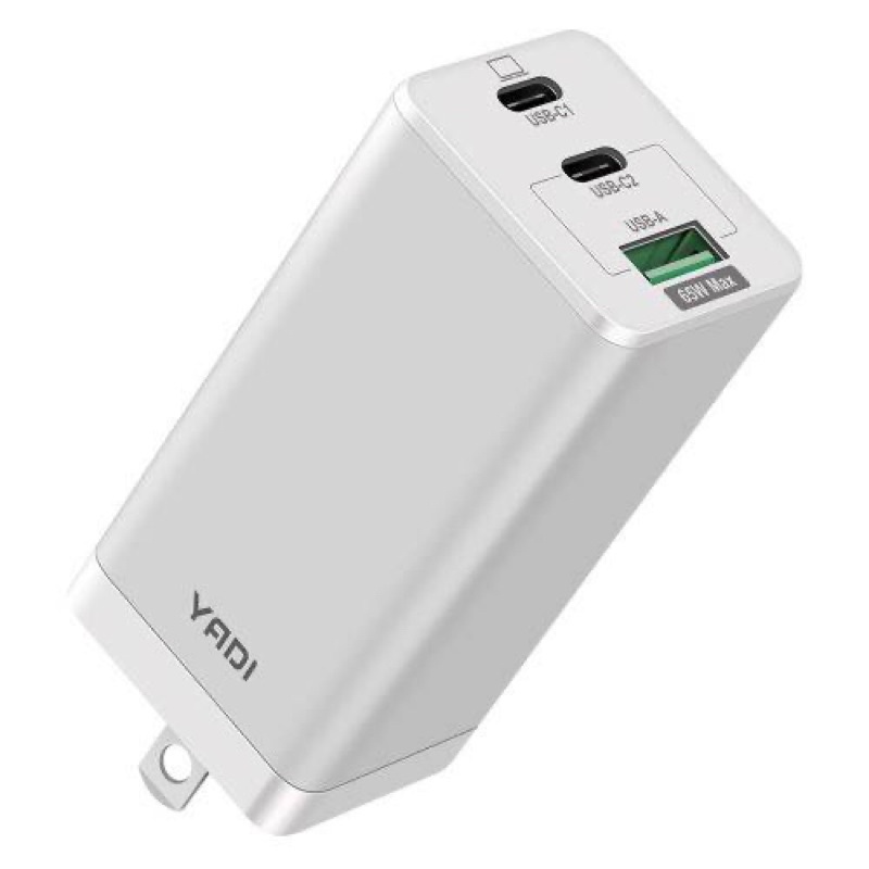 【YADI】GaN 氮化鎵快充充電器/65W(瓦)/PD/QC/BSMI認證/2C1A三孔/白台灣賣家支援任何市售快充線