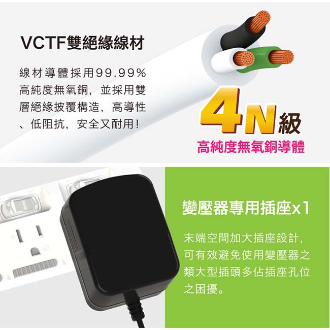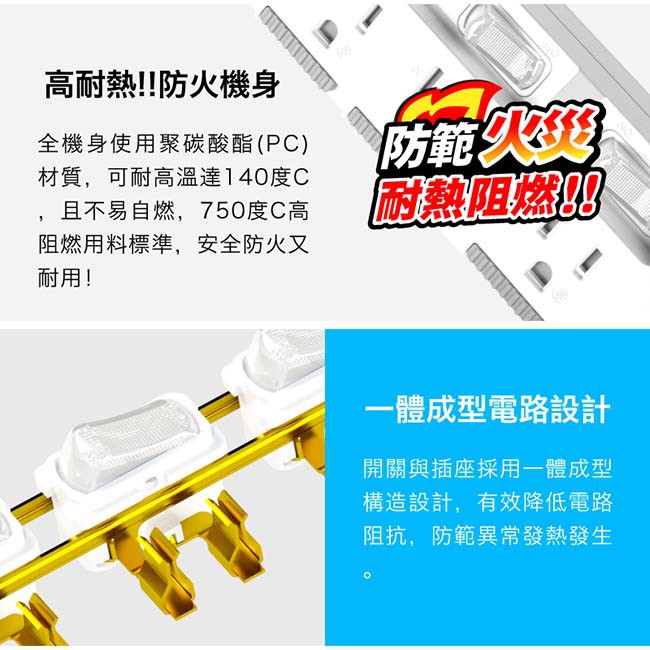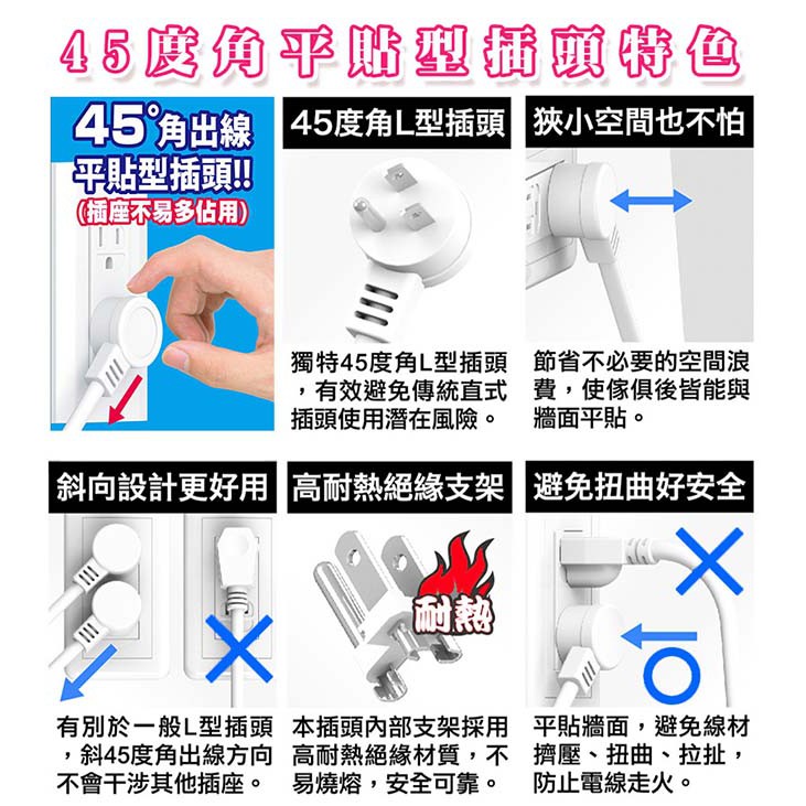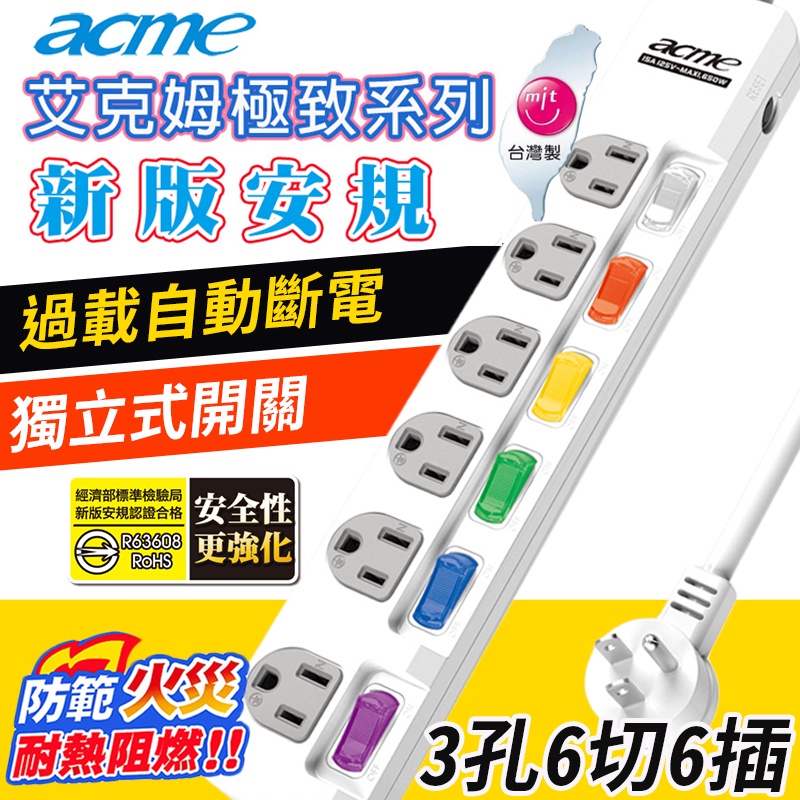 【acme】台灣製 3孔6切6插延長線 變壓器專用 新安規 自動斷電 下陷獨立開關 耐熱阻燃 L型插頭 抗雷擊 壁掛設計