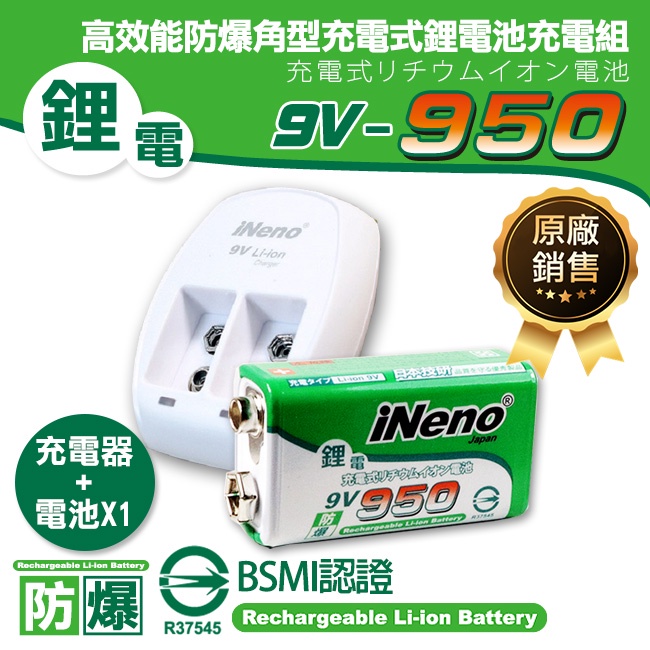 【iNeno】9V-950高效能防爆角型可充式鋰電池+9V鋰電專用充電器