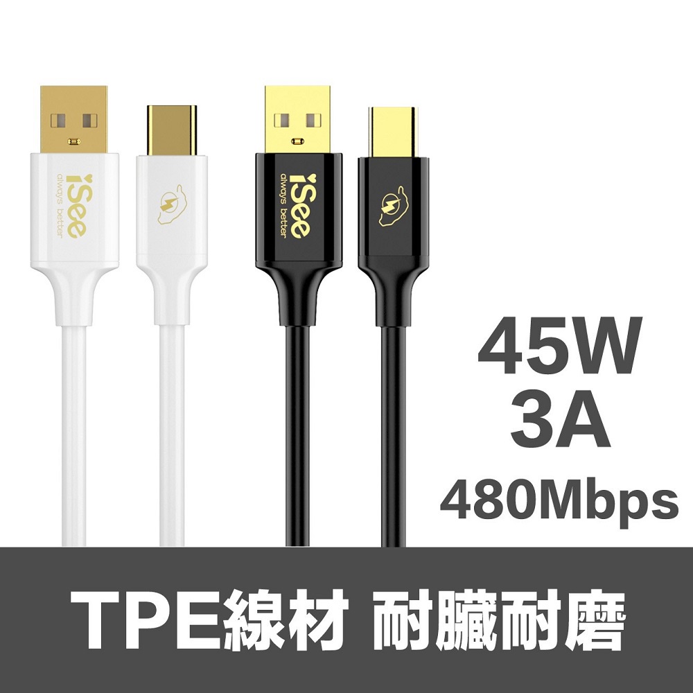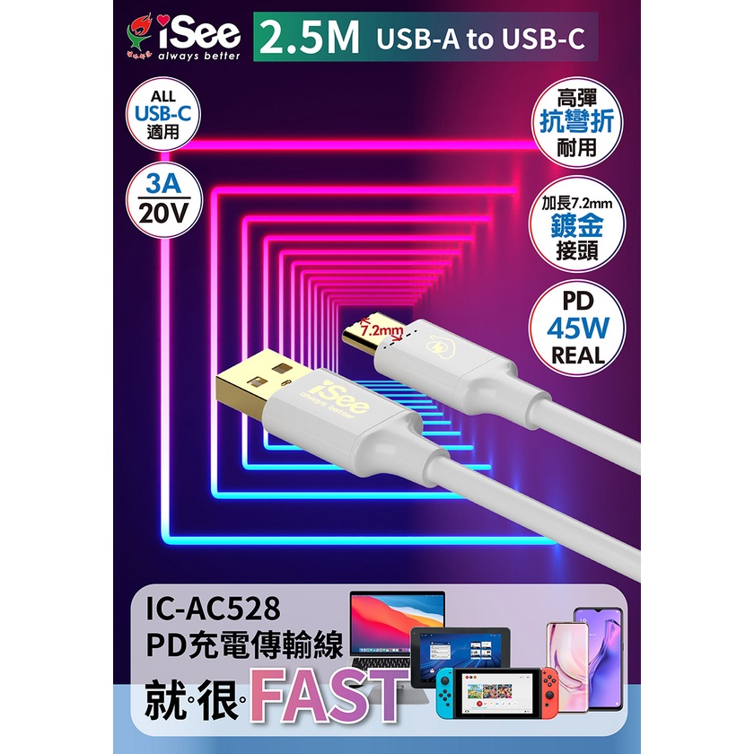 【iSee】45W PD 充電線 USB-C傳輸線 1.5米 2.5米 (AC526 AC528) 快充線 type-c