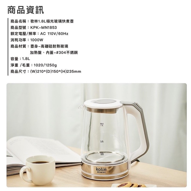 【kolin 歌林】1.8L極光玻璃快煮壺(KPK-MN1853)