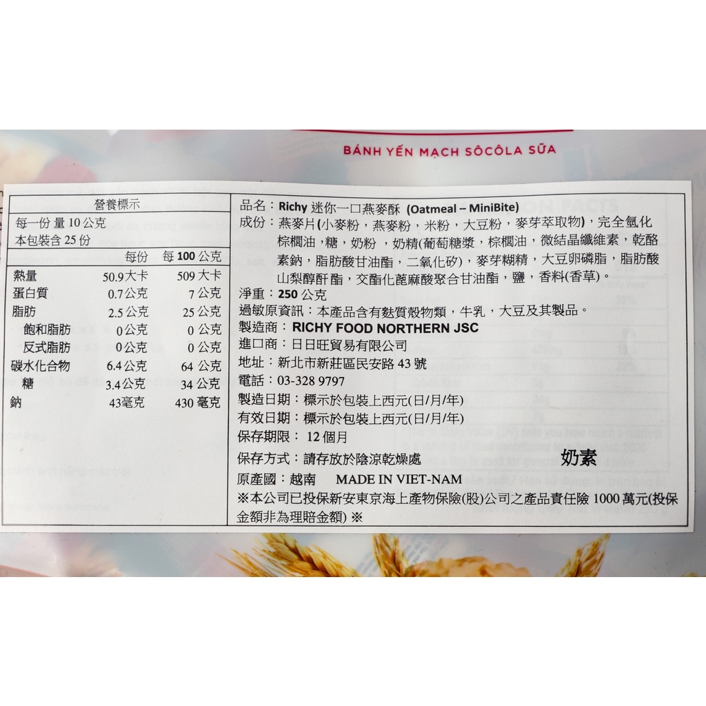 一口燕麥酥 250g/袋 迷你一口燕麥酥 牛奶燕麥酥 日日旺 Richy Oatmeal 燕麥酥 燕麥餅