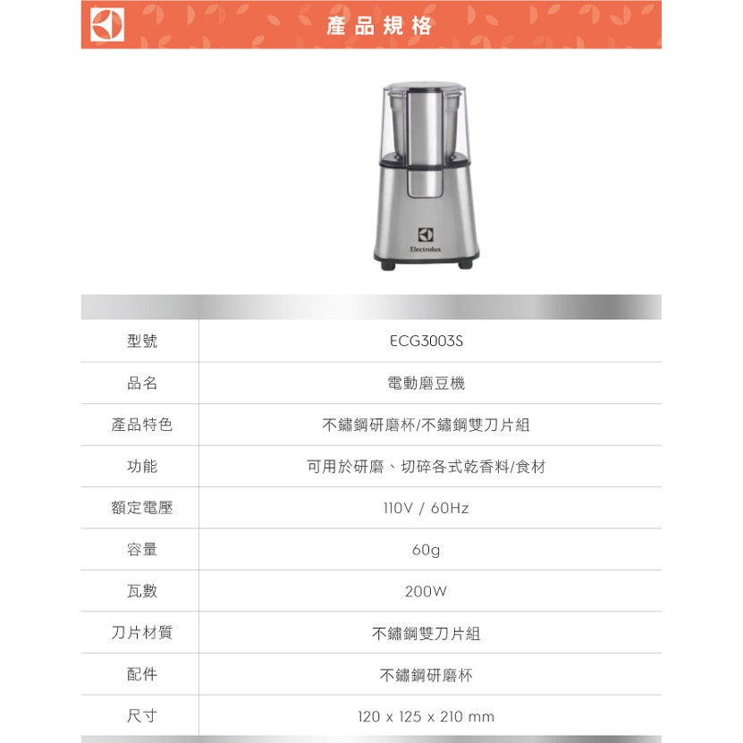 伊萊克斯Electrolux 多功能研磨/切碎機/磨豆機ECG3003S