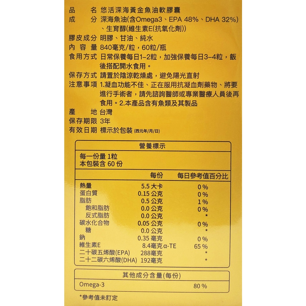 用10%蝦幣券=9折 裸瓶無外盒去批號 悠活原力 高單位深海黃金魚油 軟膠囊 60粒/瓶【博士藥妝】