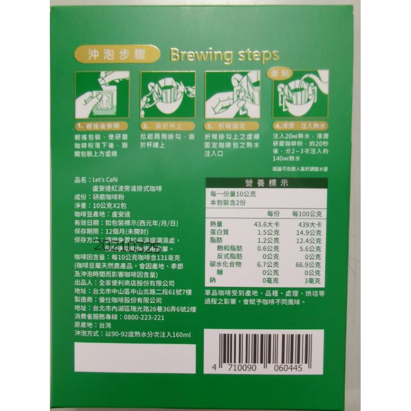 全家 FamilyMart 盧安達紅波旁 濾掛式單品咖啡(每盒2入)