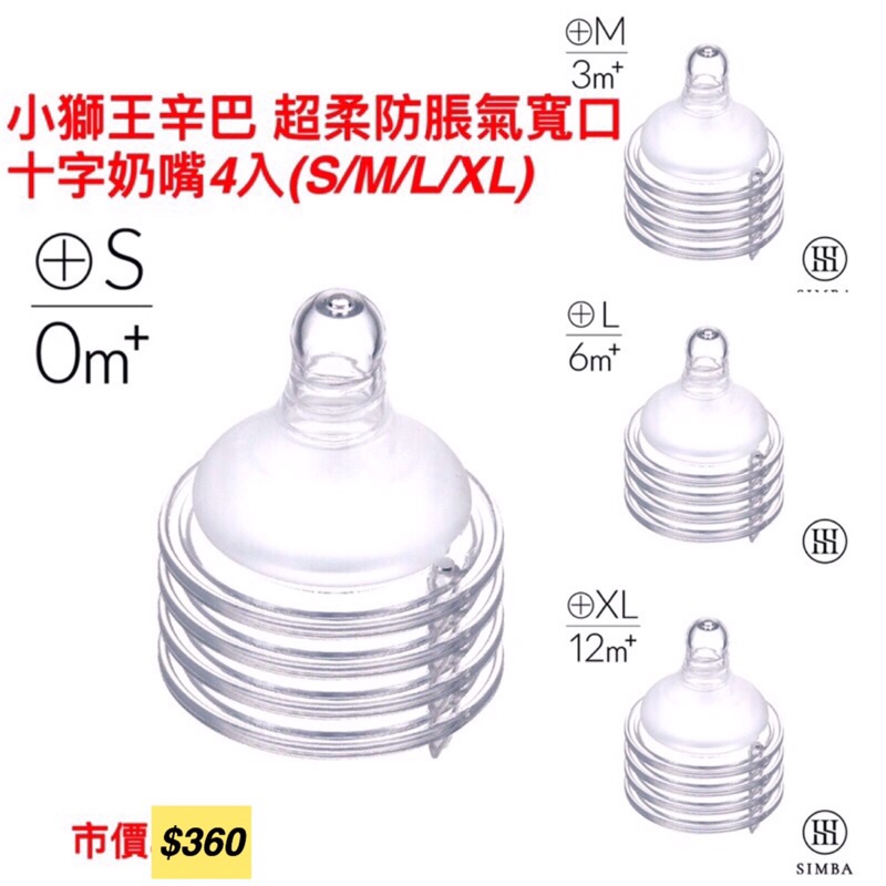 全新-小獅王辛巴 超柔防脹氣寬口十字奶嘴4入(S/M/L/XL)