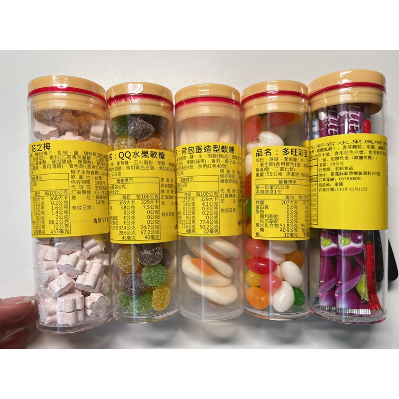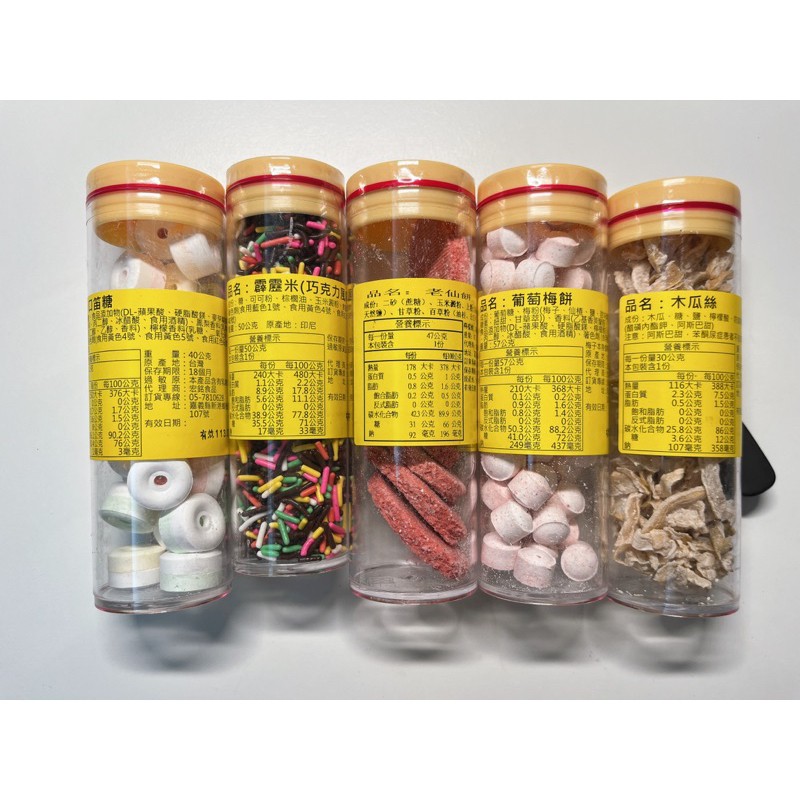 古早味糖果 巧克力米 木瓜絲 無花果 仙楂丸 七珍梅 滿天星 荷包蛋 棉花糖 花之梅 話梅 圈軟糖 口笛糖 話梅片