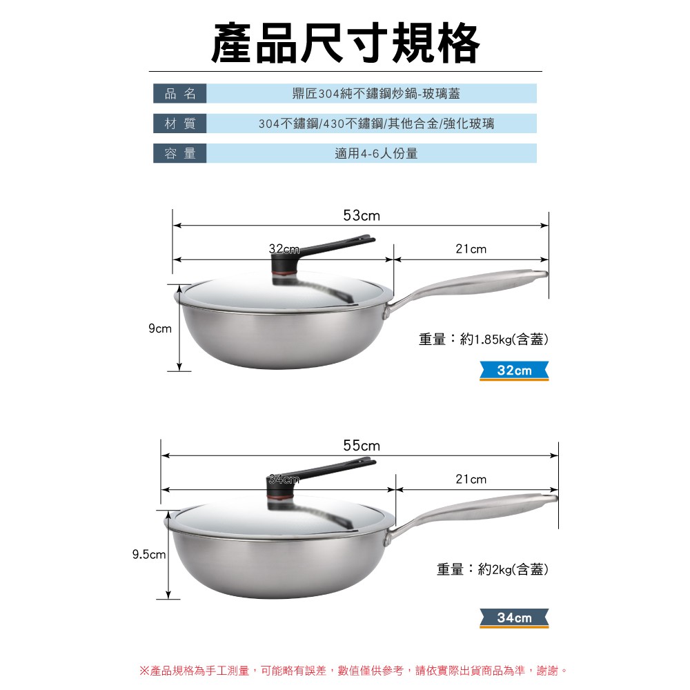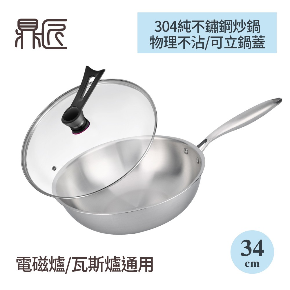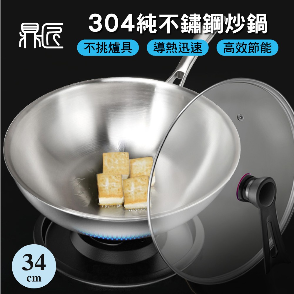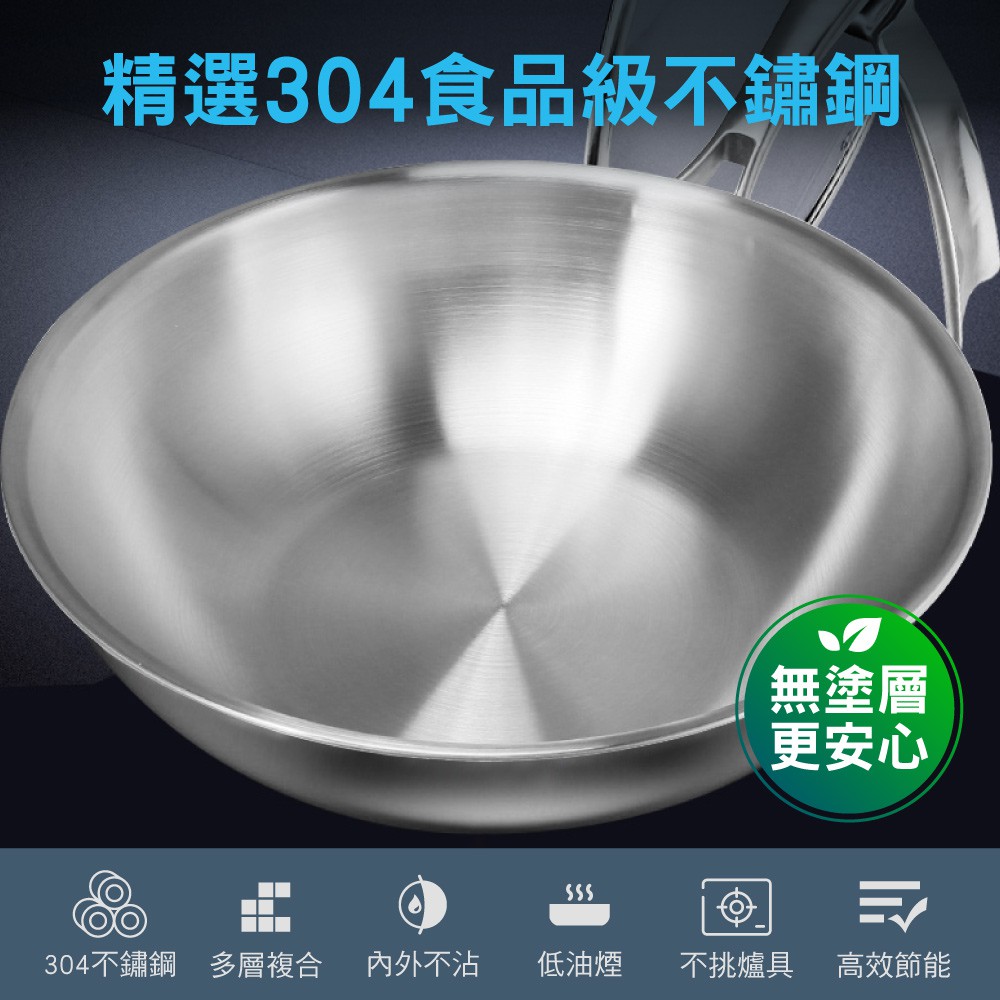 免運 台灣現貨【鼎匠】限時特價★極緻304無塗層 純不鏽鋼炒鍋34cm-電磁爐適用 可立玻璃鍋蓋 複合金高效節能物理不沾